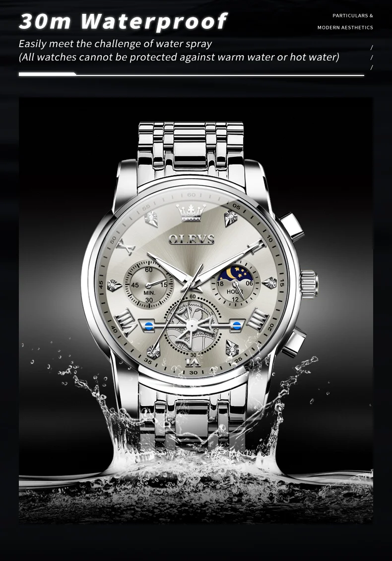 - > Olevs relógios masculinos clássico multifuncional fltwheel cronógrafo original relógio de pulso de quartzo fase da lua 24 horas à prova dwaterproof água reloj
