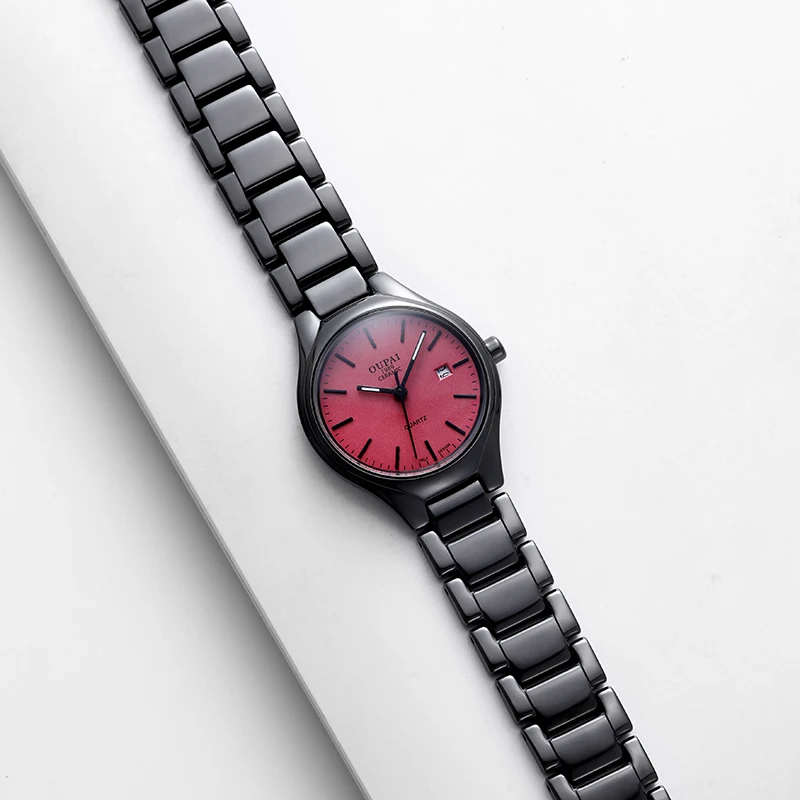 - > OUPAI-Relógio de quartzo design industrial para mulheres, cerâmica preta, mostrador vermelho, vestido pequeno e causal, moda, nova chegada, 2024