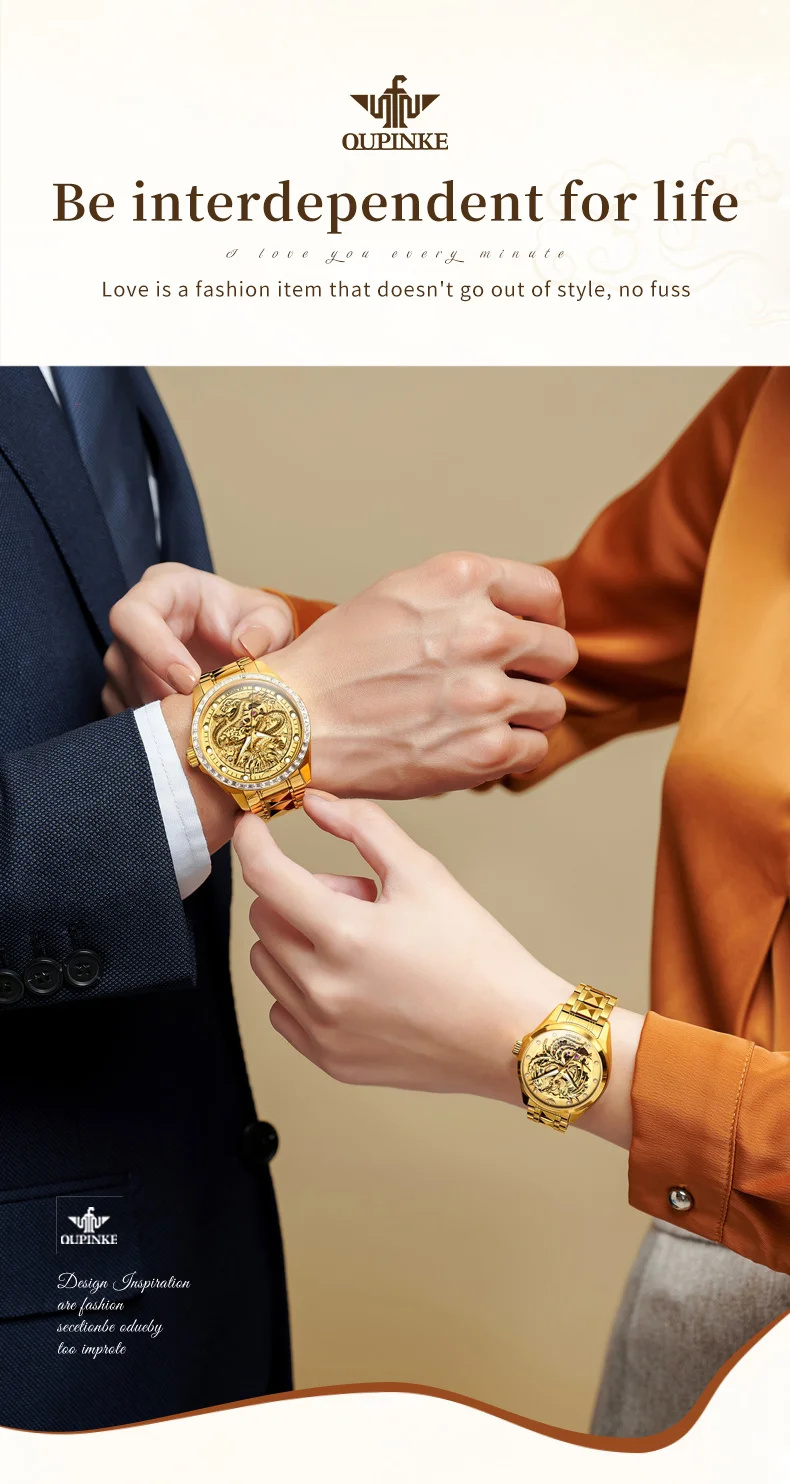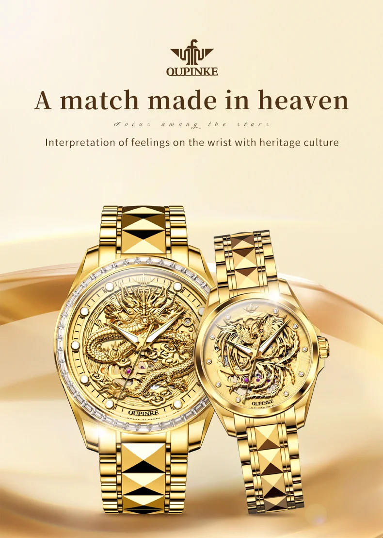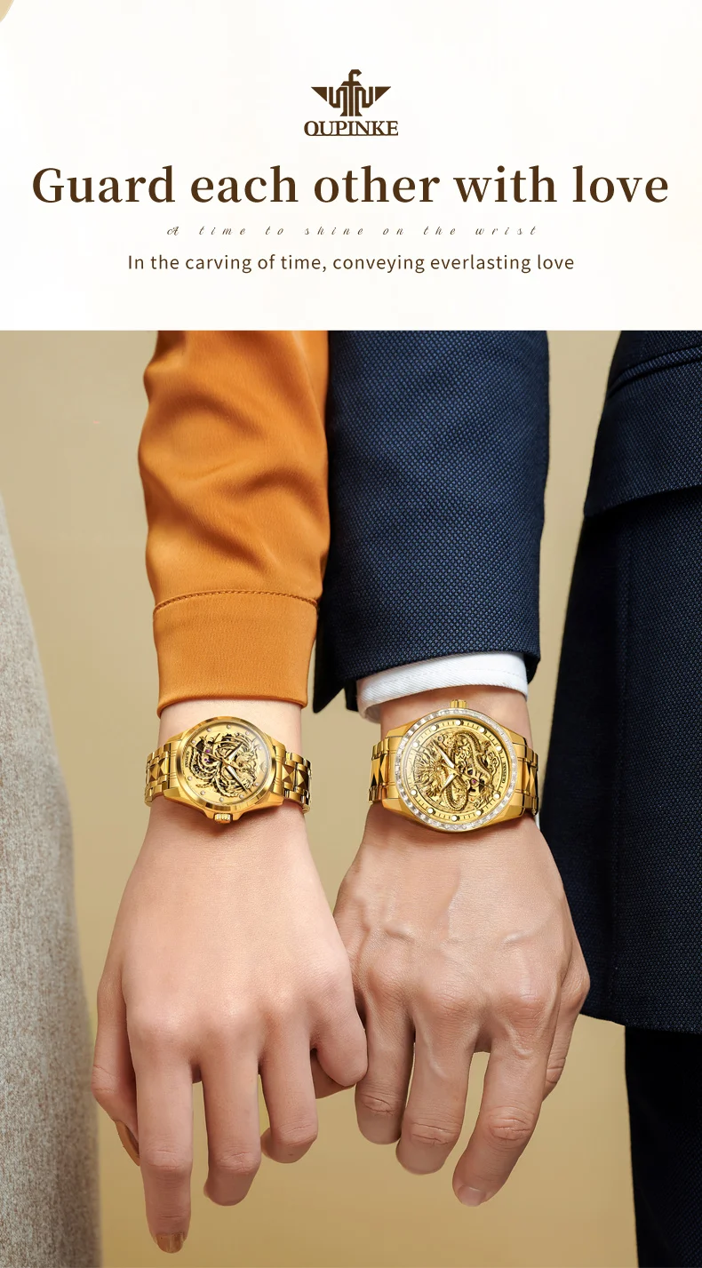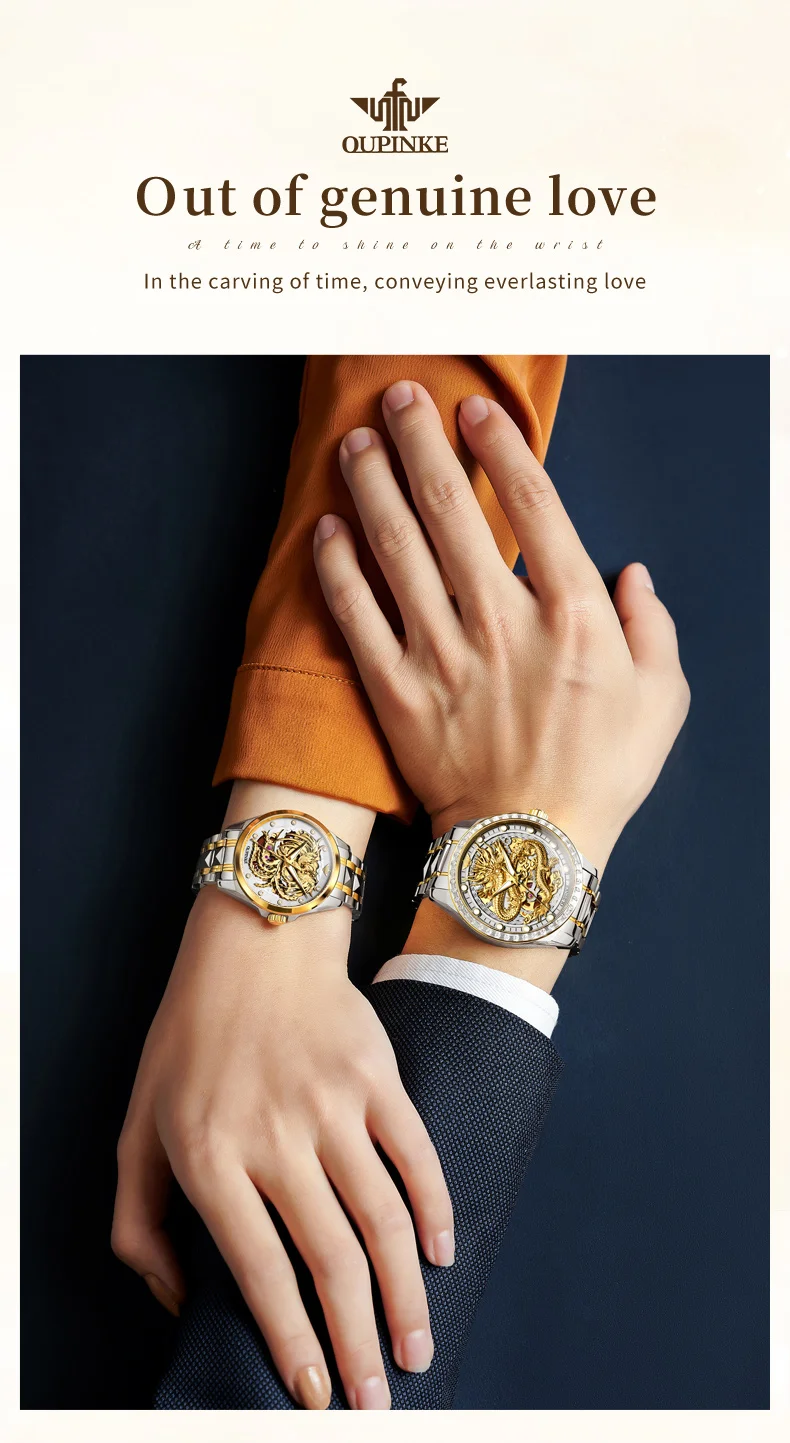 - > OUPINKE-impermeável relógio mecânico automático para casal, tungstênio tira de aço, movimento importado, dourado, luxo, original