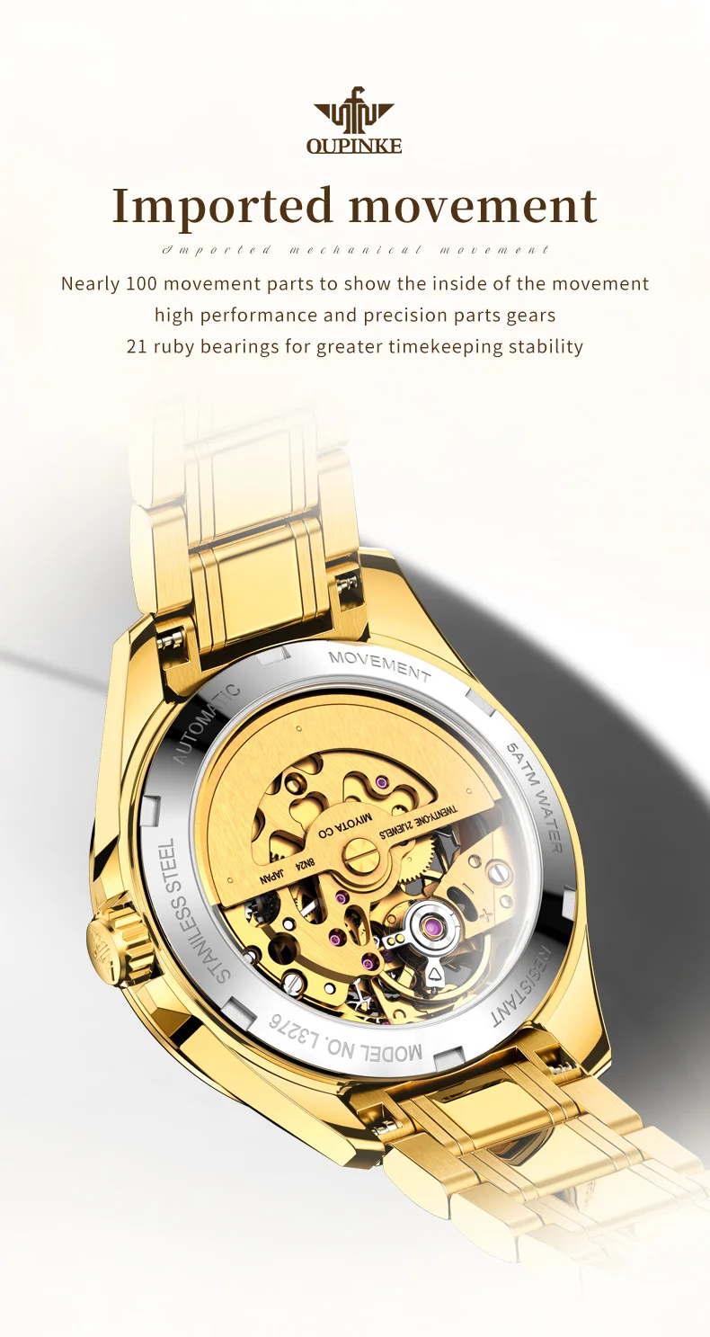 OUPINKE-impermeável relógio mecânico automático para casal, tungstênio tira de aço, movimento importado, dourado, luxo, original