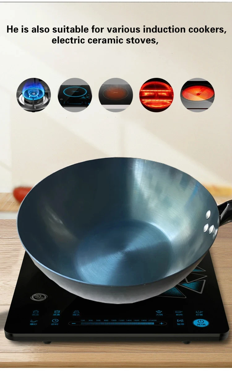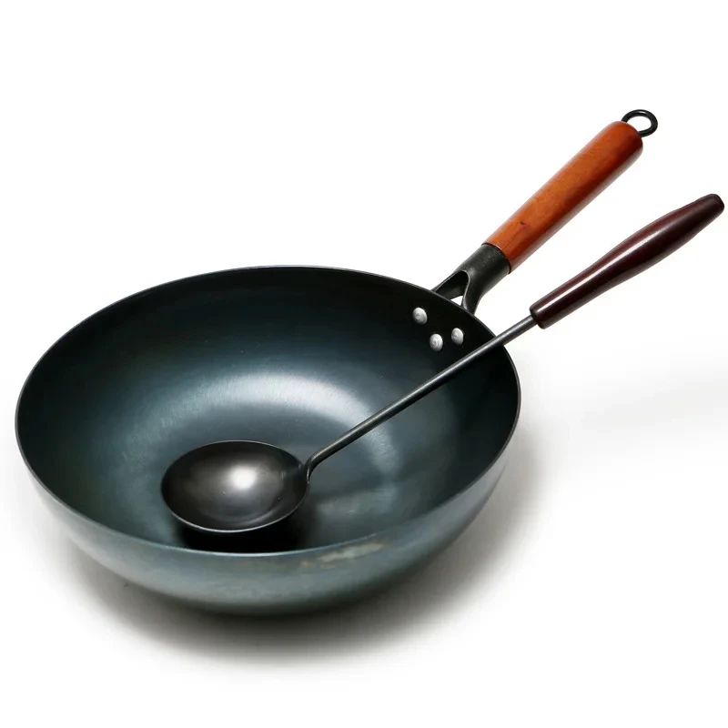Panela de ferro doméstico com cabo de madeira, frigideira estilo antigo, forjado à mão tradicional sem revestimento, sem ferro, 30cm