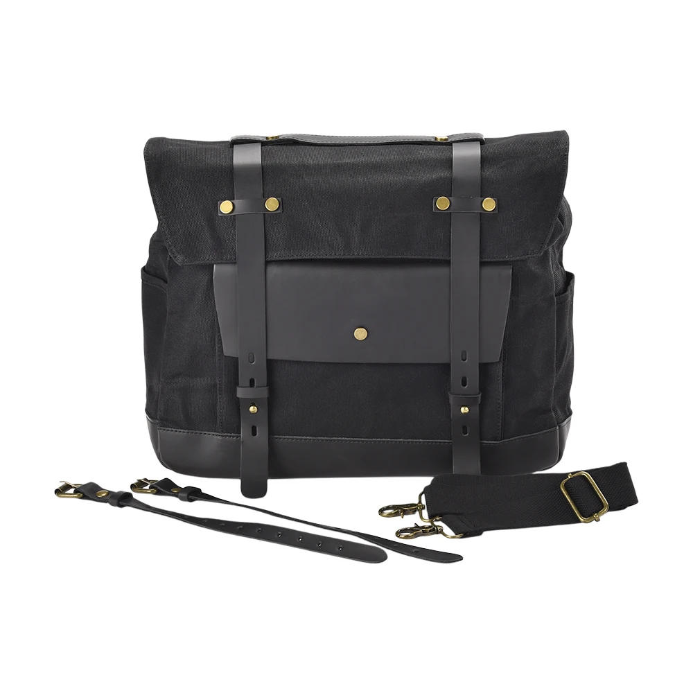 Esta bolsa mailman é feita de lona impermeável encerada com uma camada superior de couro de cavalo louco, retrô desgastado.