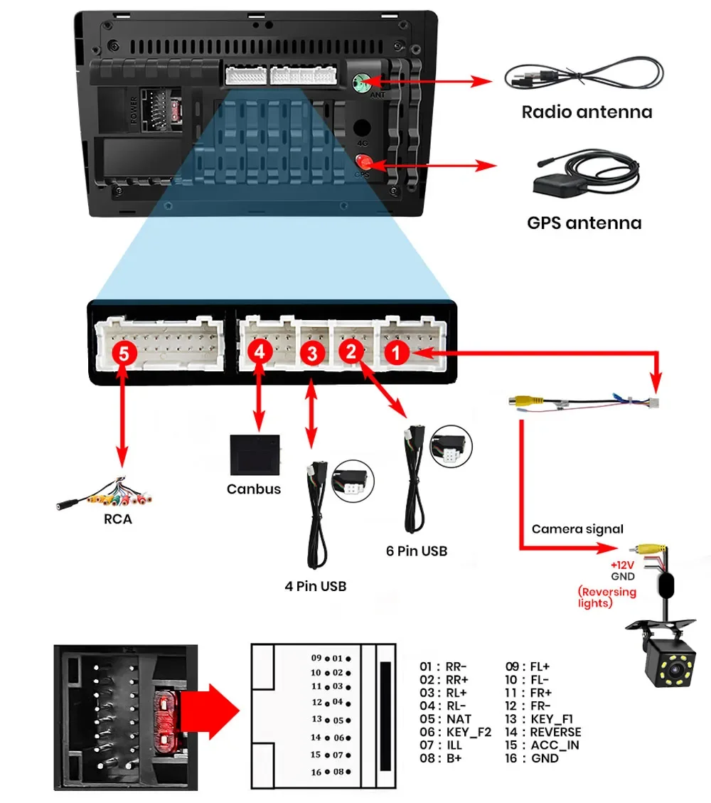 Nota: A porta de vídeo da câmera traseira deve inserir a porta ""CAMIN"" do rádio do carro.