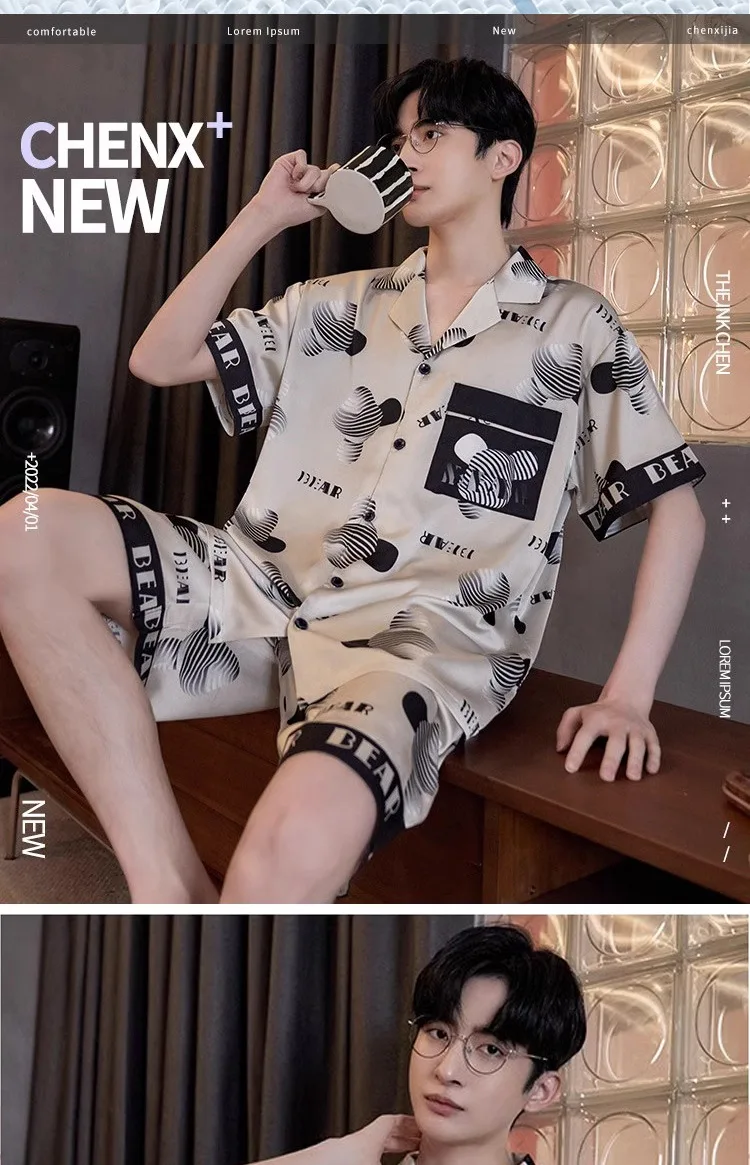 Pijama de seda gelo de duas peças masculino, shorts de manga curta, seção fina, estudante, terno homewear adolescente, verão, novo