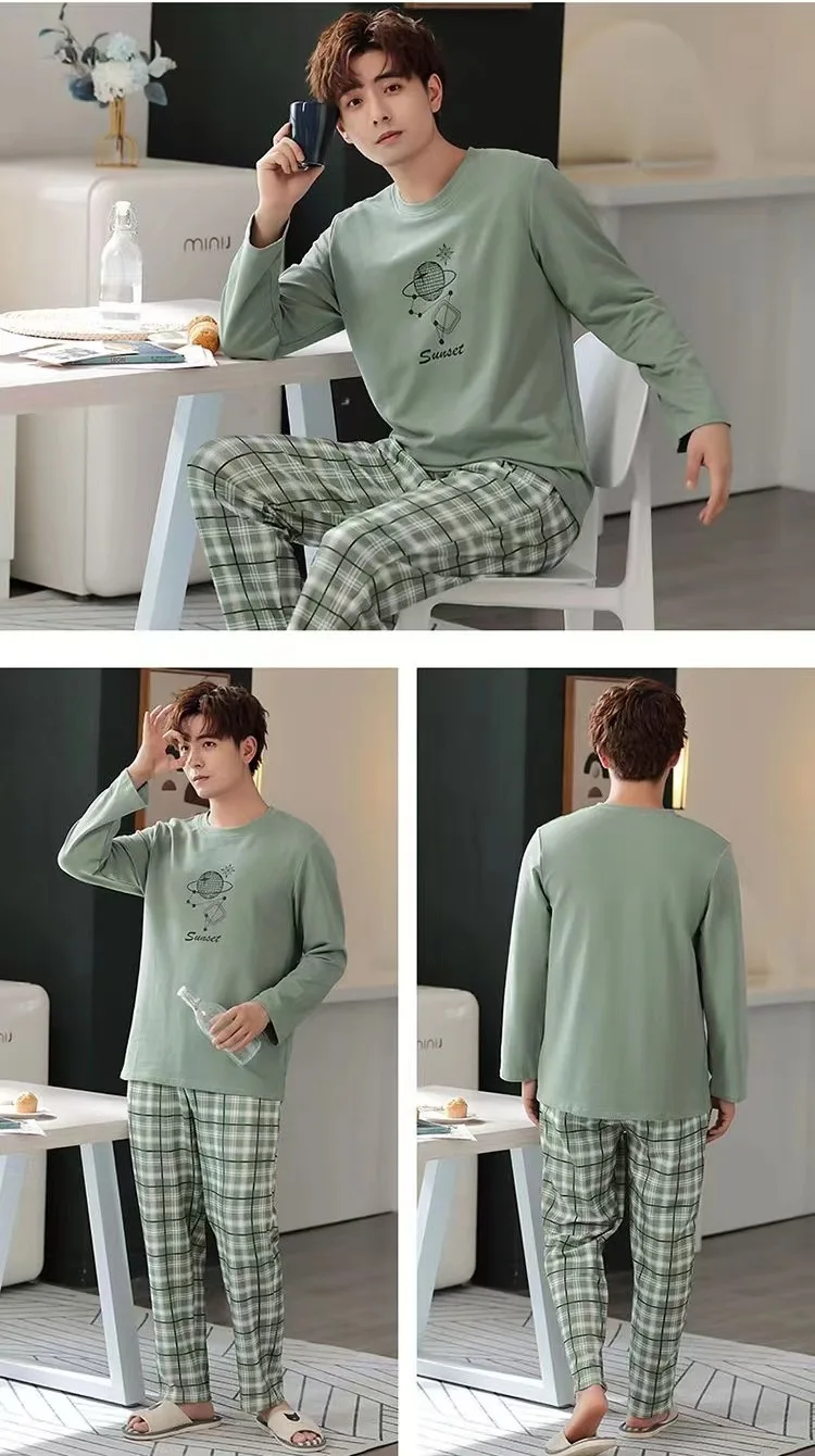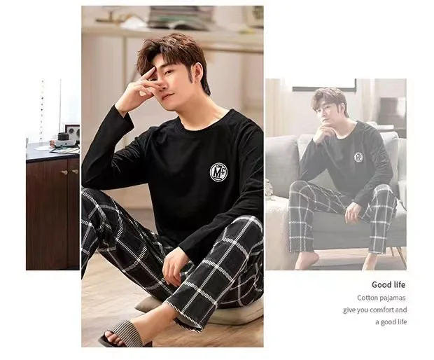 - > Pijama masculino de manga comprida de duas peças, pijama de seção fina, terno de lazer, tamanho grande, primavera e outono