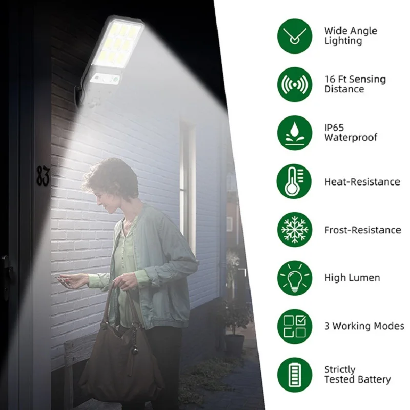 Poderosa lâmpada de parede solar para exterior, led, pátio, 3 modos, indução de corpo humano, jardim, terraço, porta de garagem, iluminação de rua