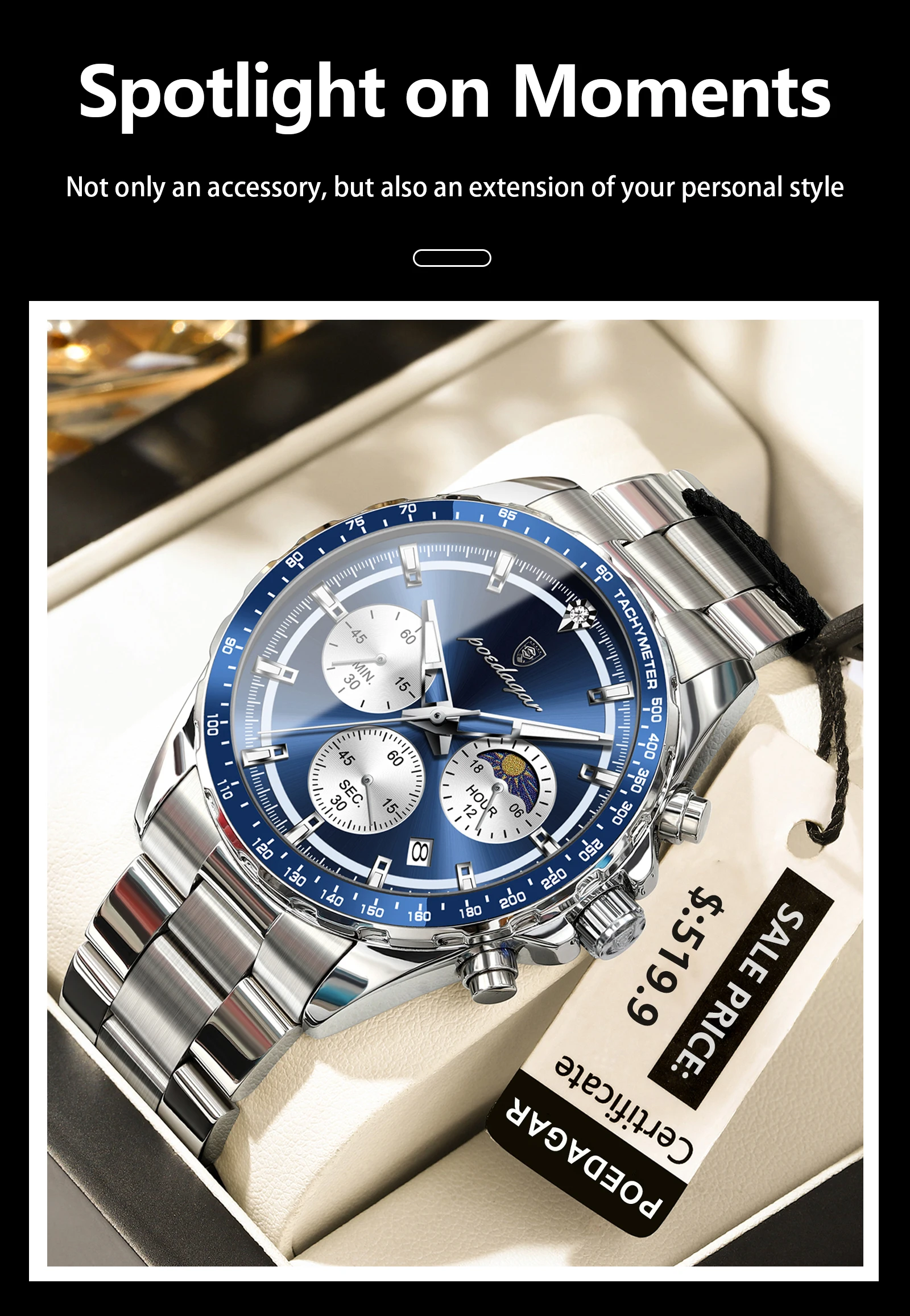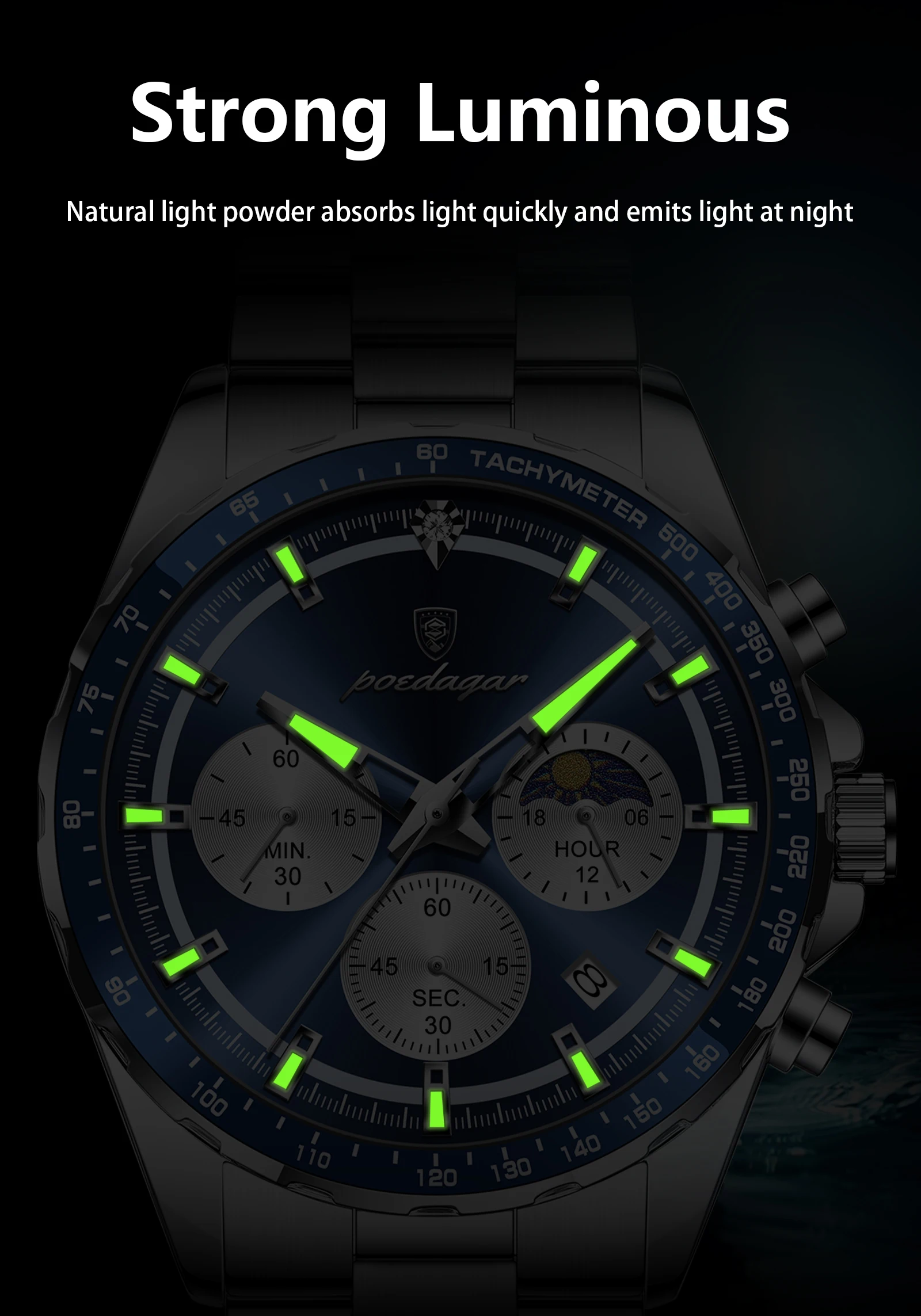 - > Poedagar relógio esportivo de luxo para homens, à prova d'água, luminoso, data, cronógrafo, relógio de pulso masculino, aço inoxidável, relógios de quartzo + caixa