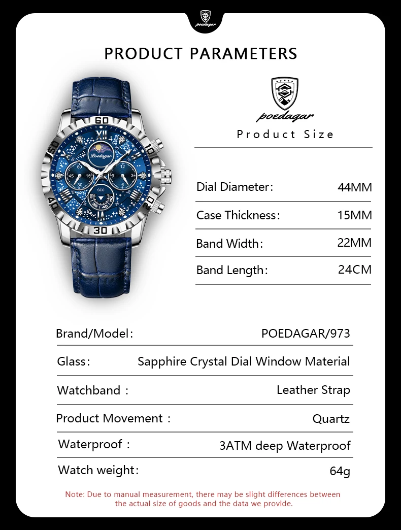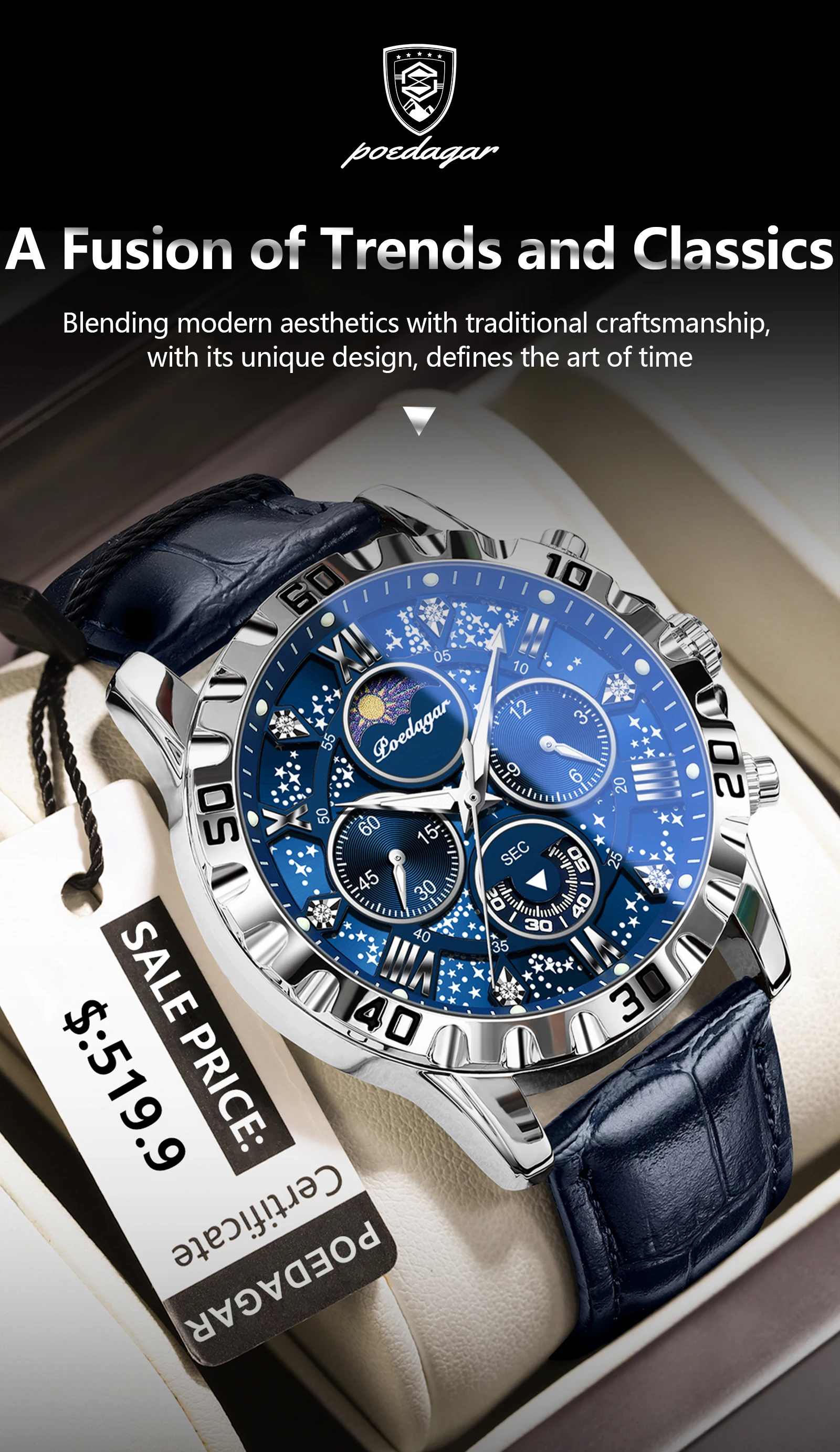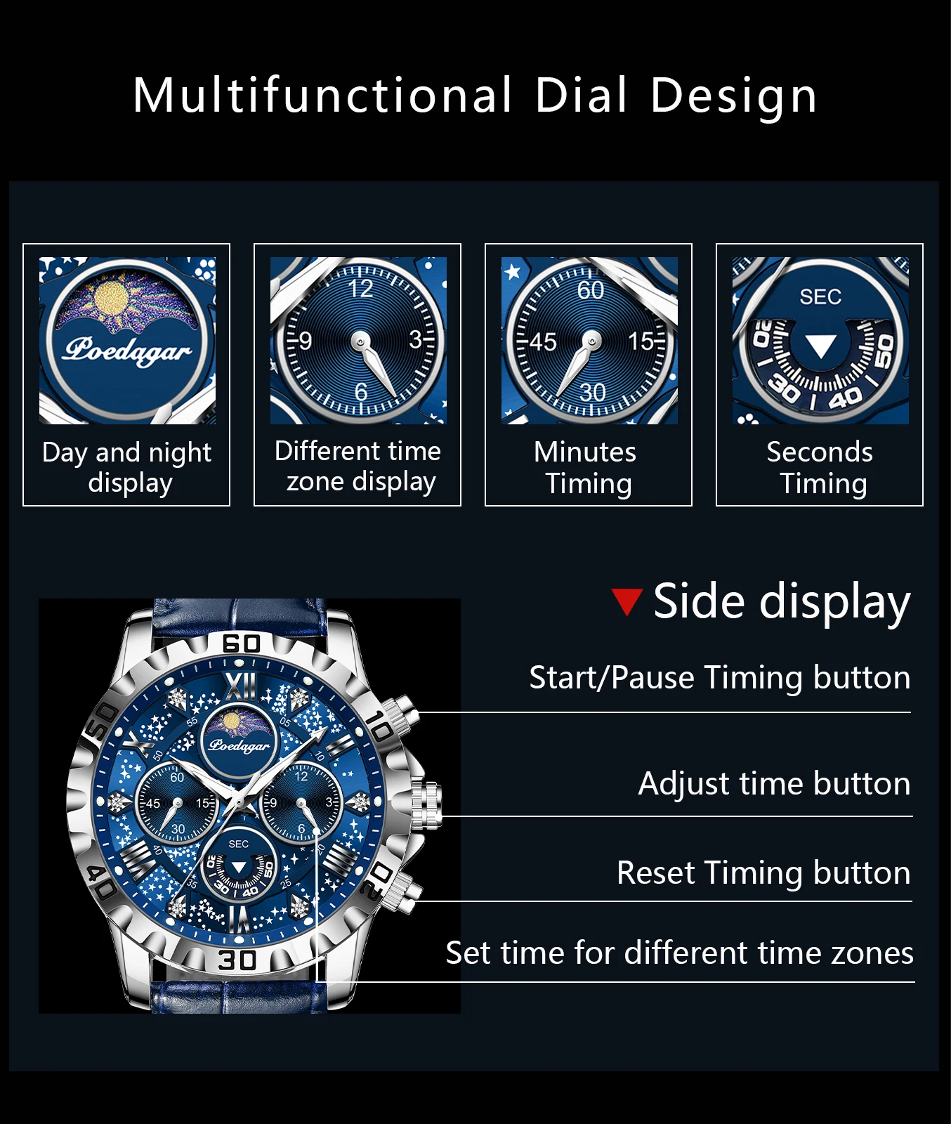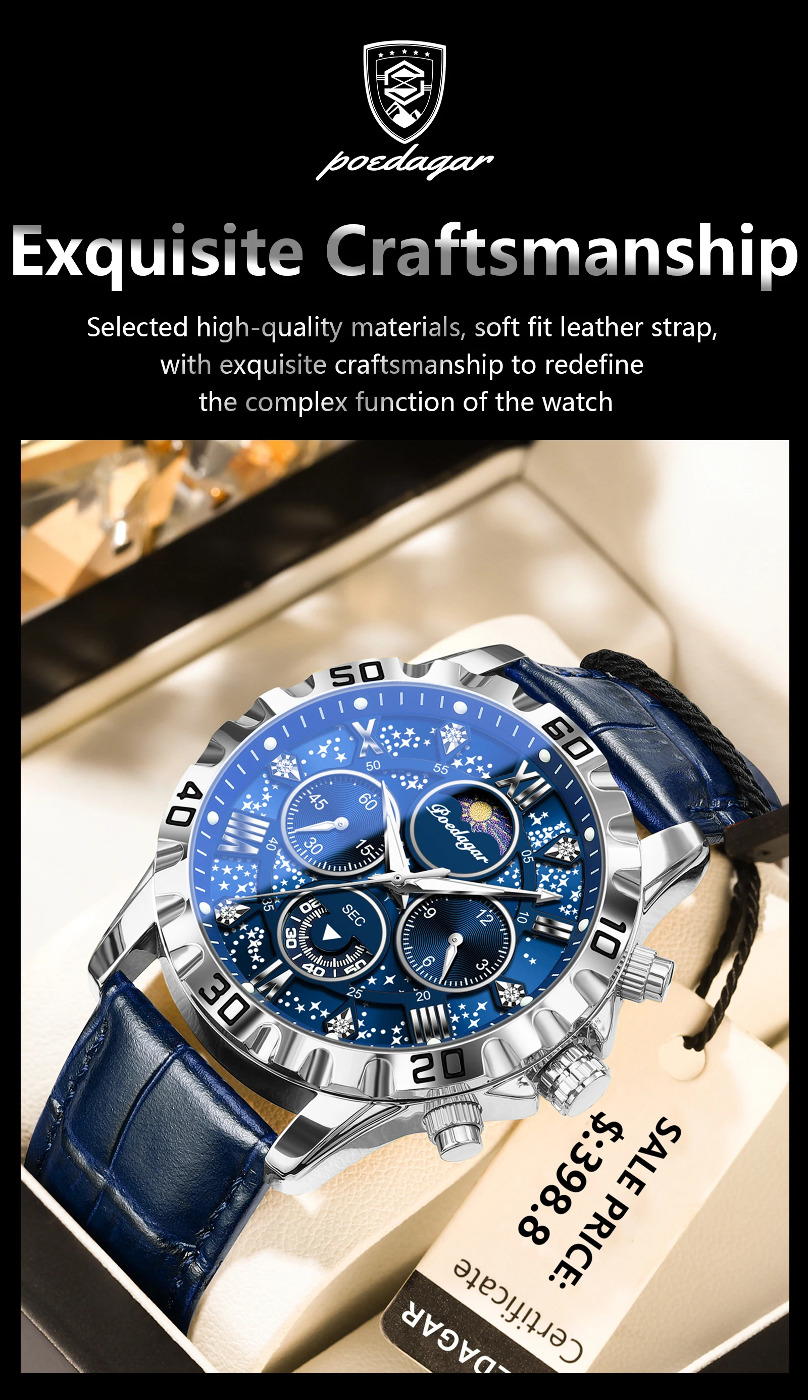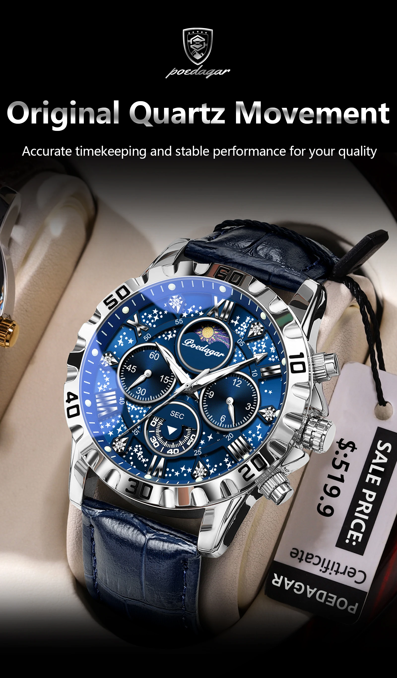 - > POEDAGAR-Relógio quartzo de couro impermeável masculino, cronógrafo luminoso, militar, alta qualidade, luxo, homem, reloj