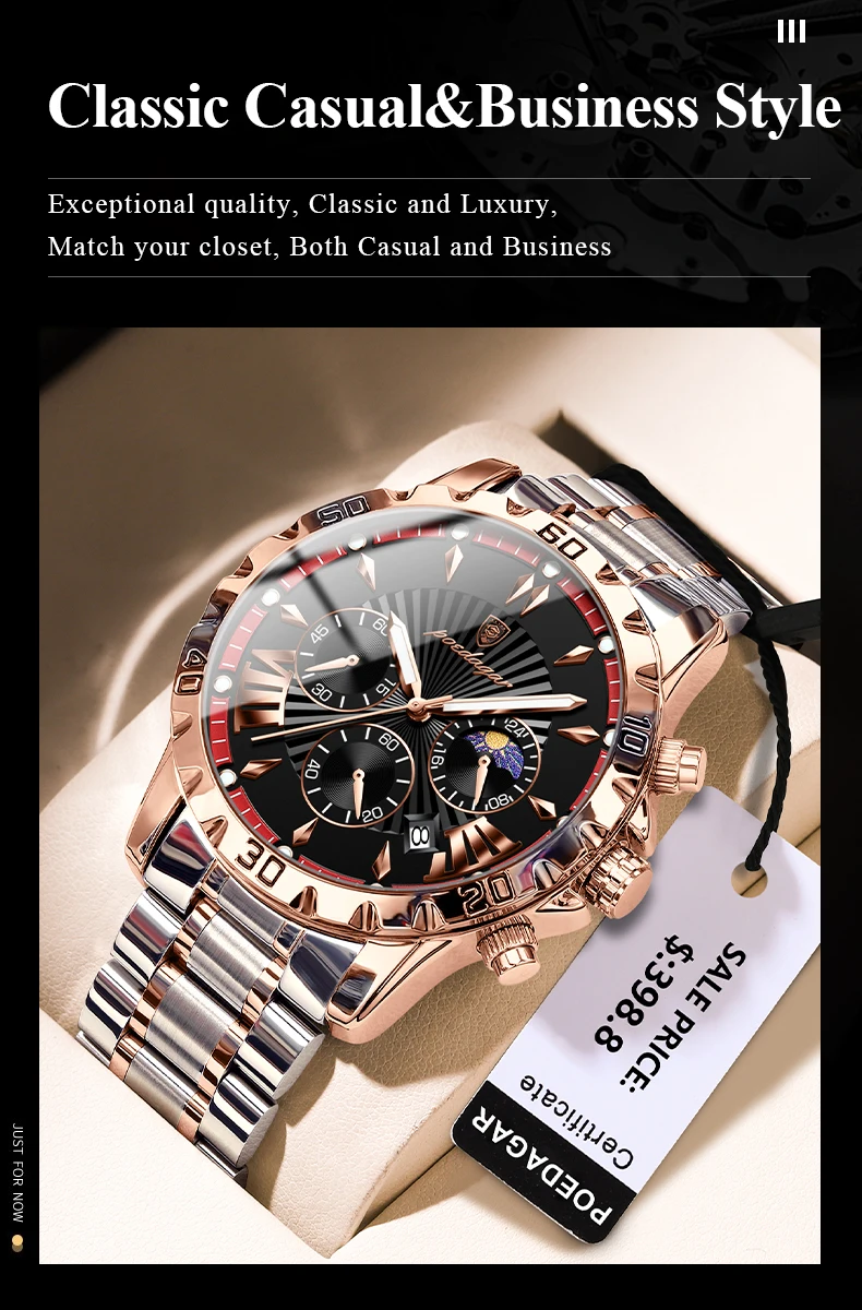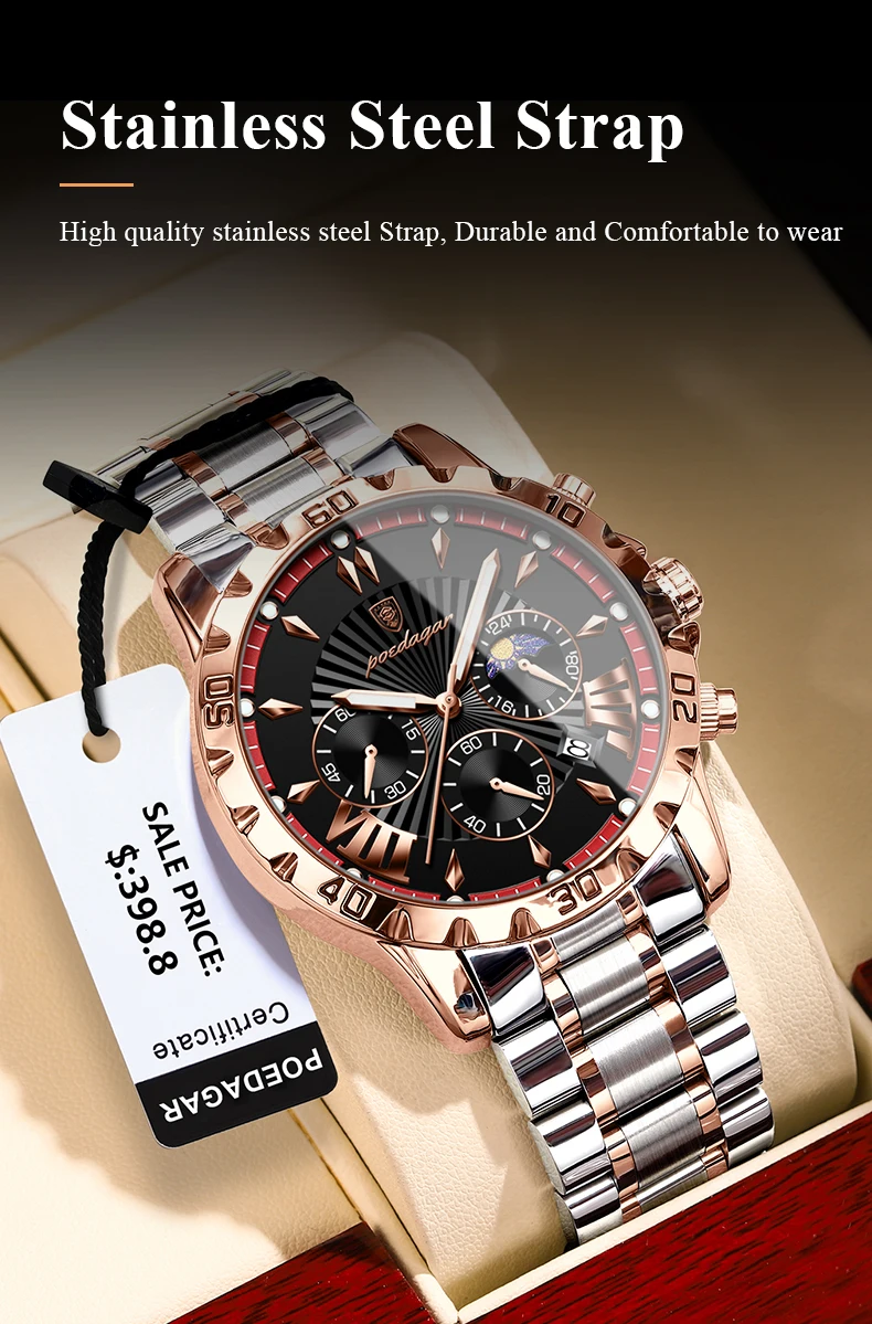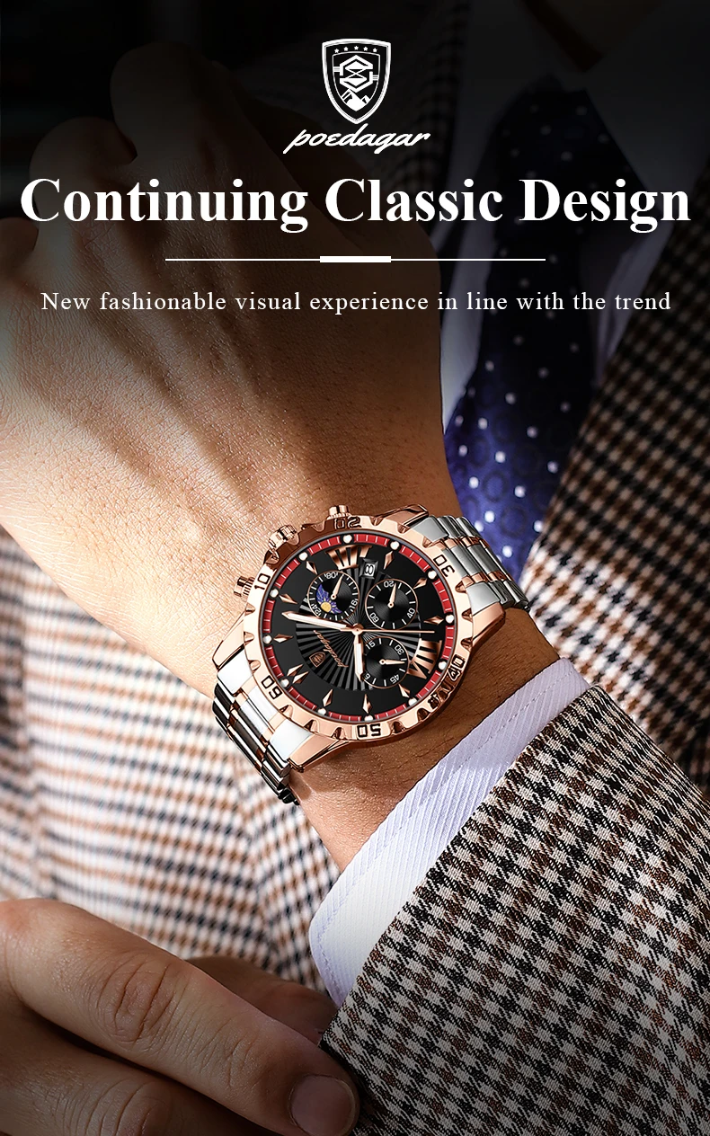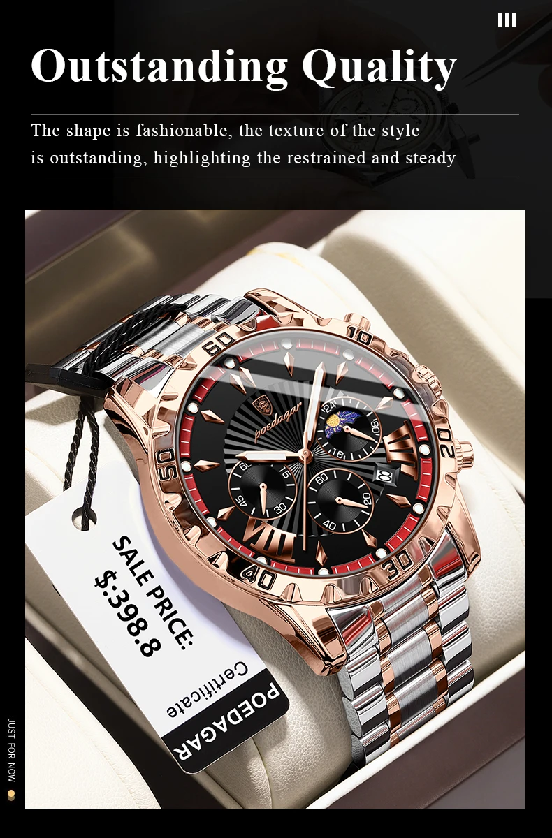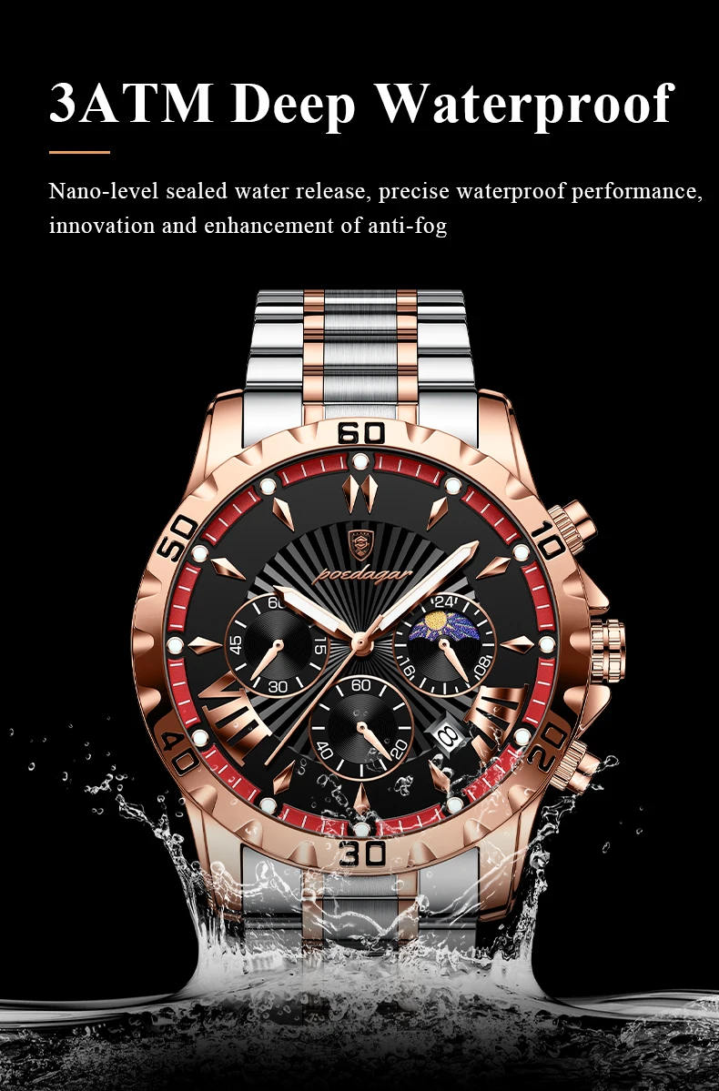 - > POEDAGAR-Relógio Quartzo de Luxo Masculino, Aço Inoxidável, Alta Qualidade, Impermeável, Luminoso, Cronógrafo, Data, Homem