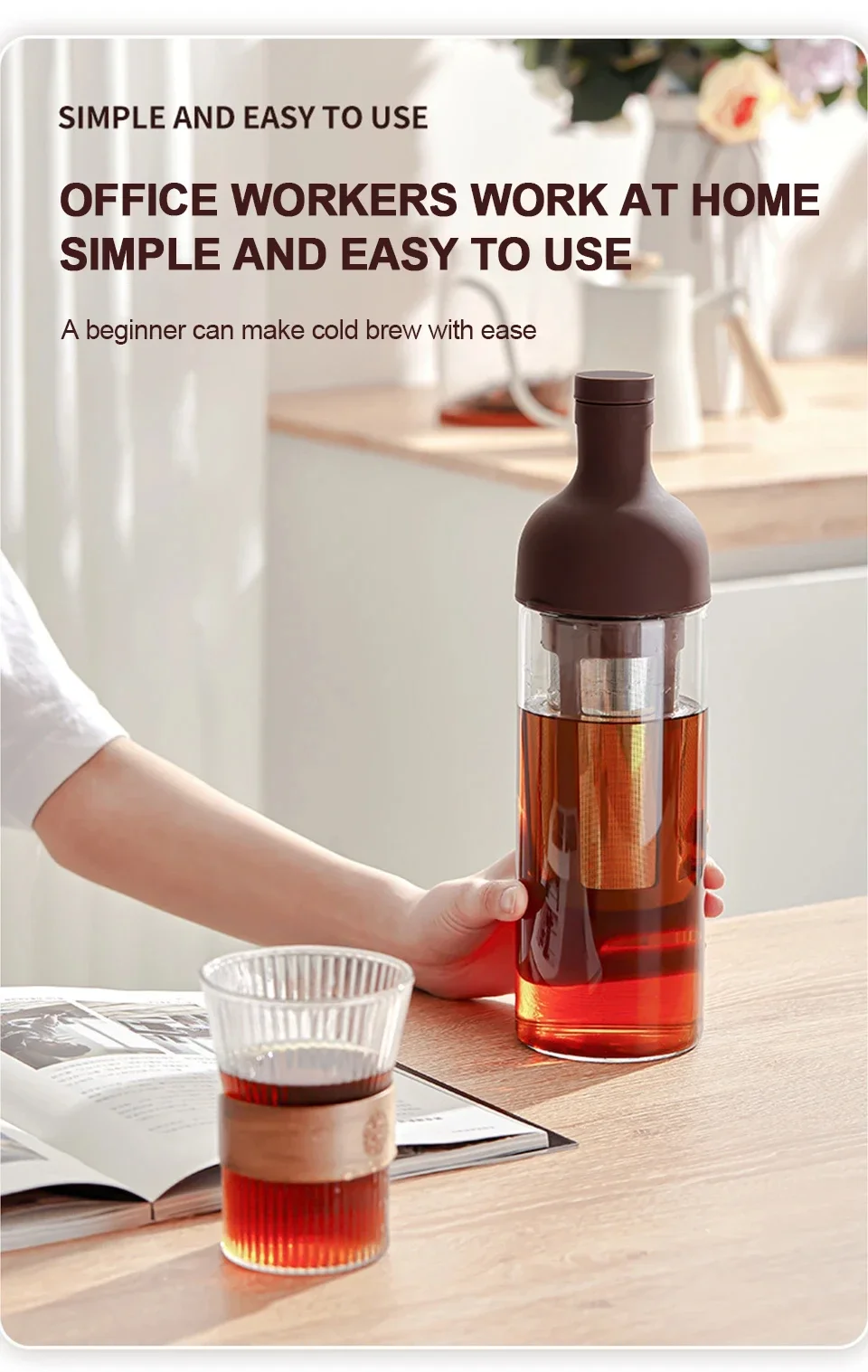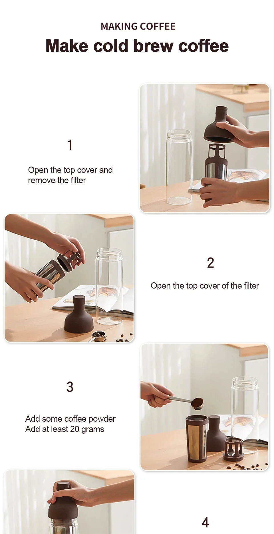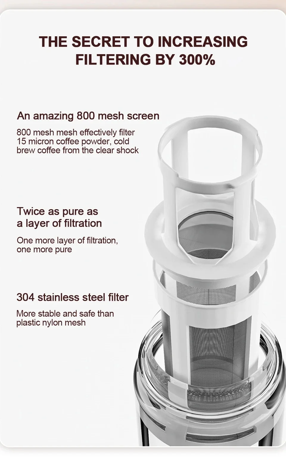 Filtro de camada dupla: Nossa cafeteira de vidro vem com um filtro, que possui um filtro de camada dupla dentro.Até o menor pó de café pode ser filtrado sem desperdiçar nenhum pó de café.O filtro de camada dupla pode fornecer um café extraído a frio mais puro.