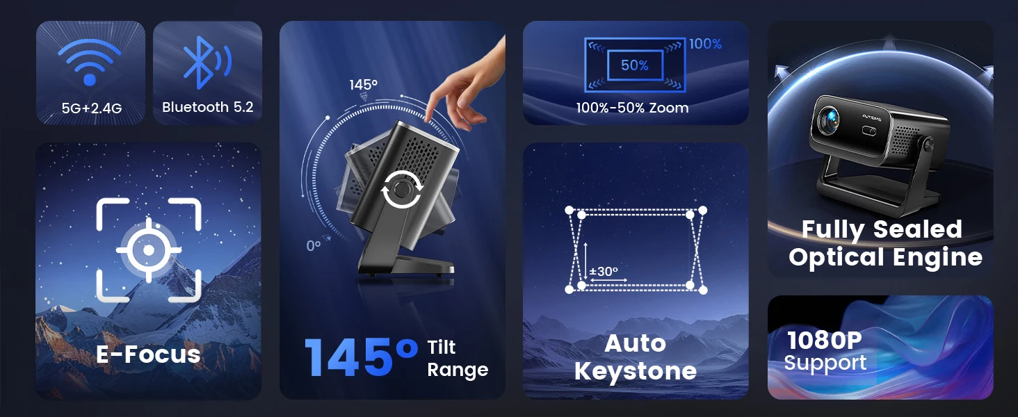 * Configuração sem esforço, visualização perfeita: O único 145° suporte ajustável permite inclinar facilmente o projetor em qualquer ângulo desejado em sua mesa ou prateleira.Juntamente com ±40° Correção Keystone, você pode obter instantaneamente uma imagem perfeitamente quadrada em praticamente qualquer posicionamento, sem ajustes complicados.