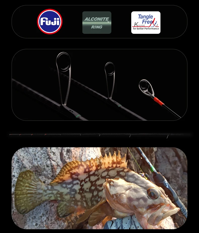 Todos os modelos são equipados com uma ponta de haste sólida enxertada composta para maior sensibilidade, permitindo uma manipulação delicada dos movimentos posturais da isca e máxima sensibilidade à mordida.