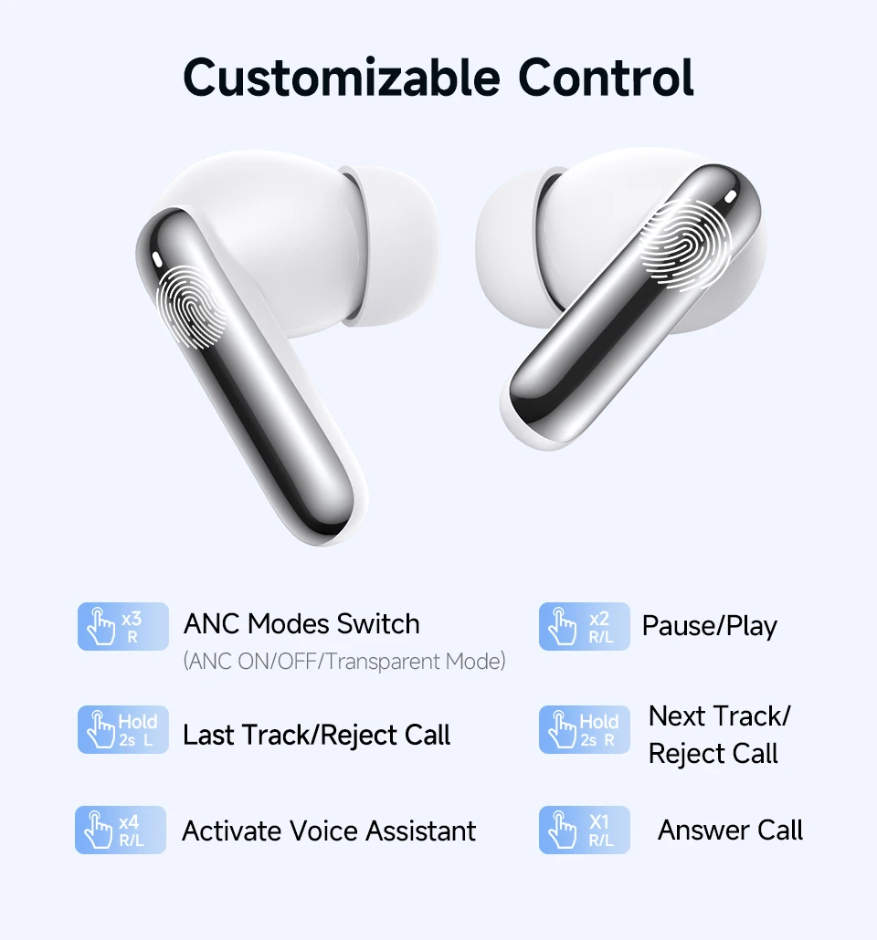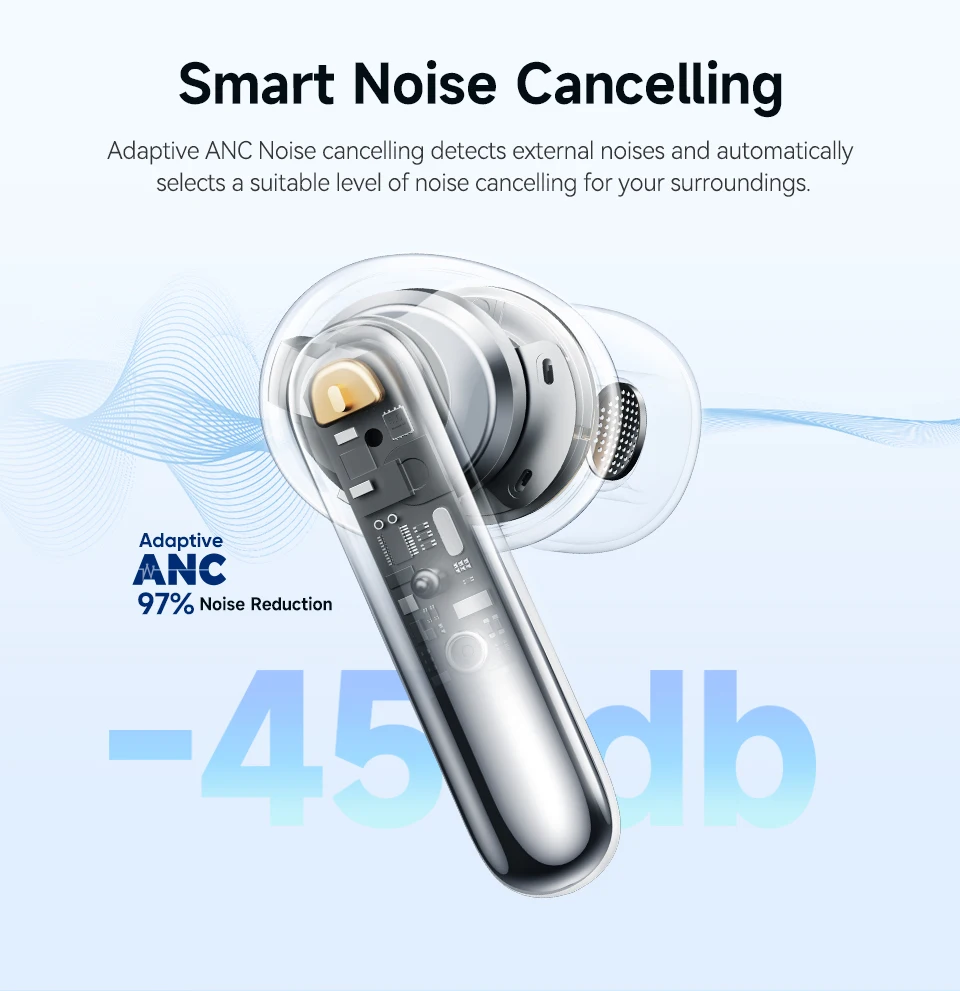 Cancelamento Ativo de Ruído Adaptável:Mergulhe no seu mundo sem distrações.Os fones de ouvido com cancelamento de ruído QCY Melobuds N50 vêm equipados com cancelamento de ruído ativo adaptativo (ANC) que se adapta de forma inteligente ao ambiente, garantindo que o ruído ambiente seja efetivamente eliminado.