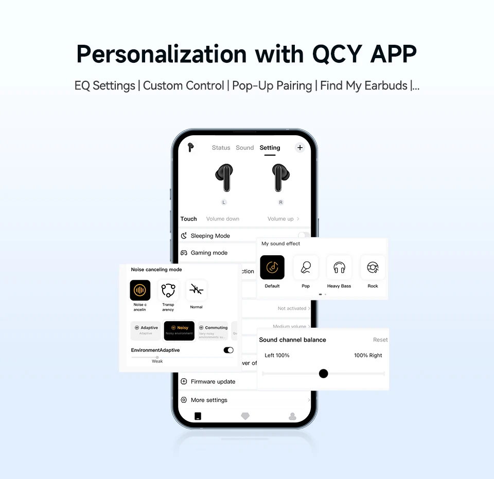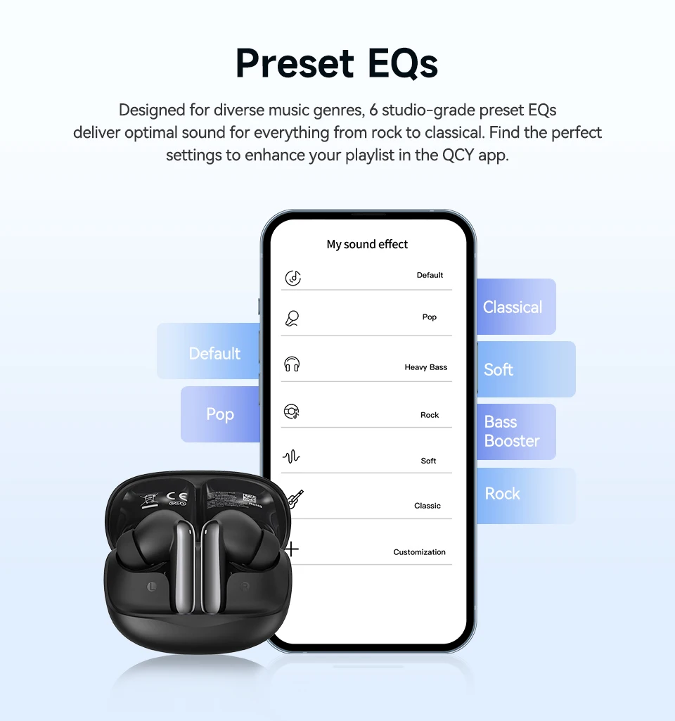 Projetados para diversos gêneros musicais, 6 EQs predefinidos para estúdio oferecem um som ideal para tudo, desde rock até clássico.Encontre as configurações perfeitas para aprimorar sua lista de reprodução no aplicativo QCY.