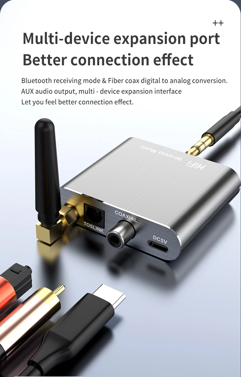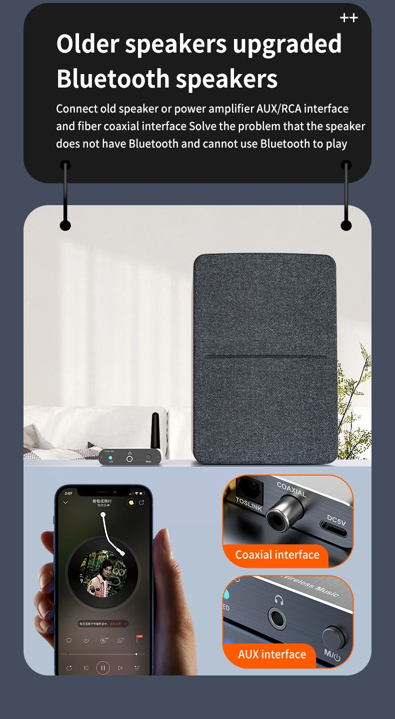 Conecte alto-falante antigo ou amplificador de potência Interface AUX/Coaxial/Fibra Óptica de 3,5 mm e interface coaxial de fibra, resolva o problema de que o alto-falante não possui Bluetooth e não pode usar Bluetooth para jogar.