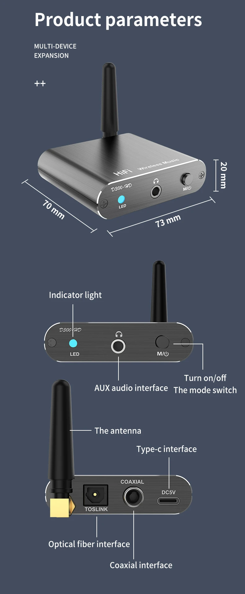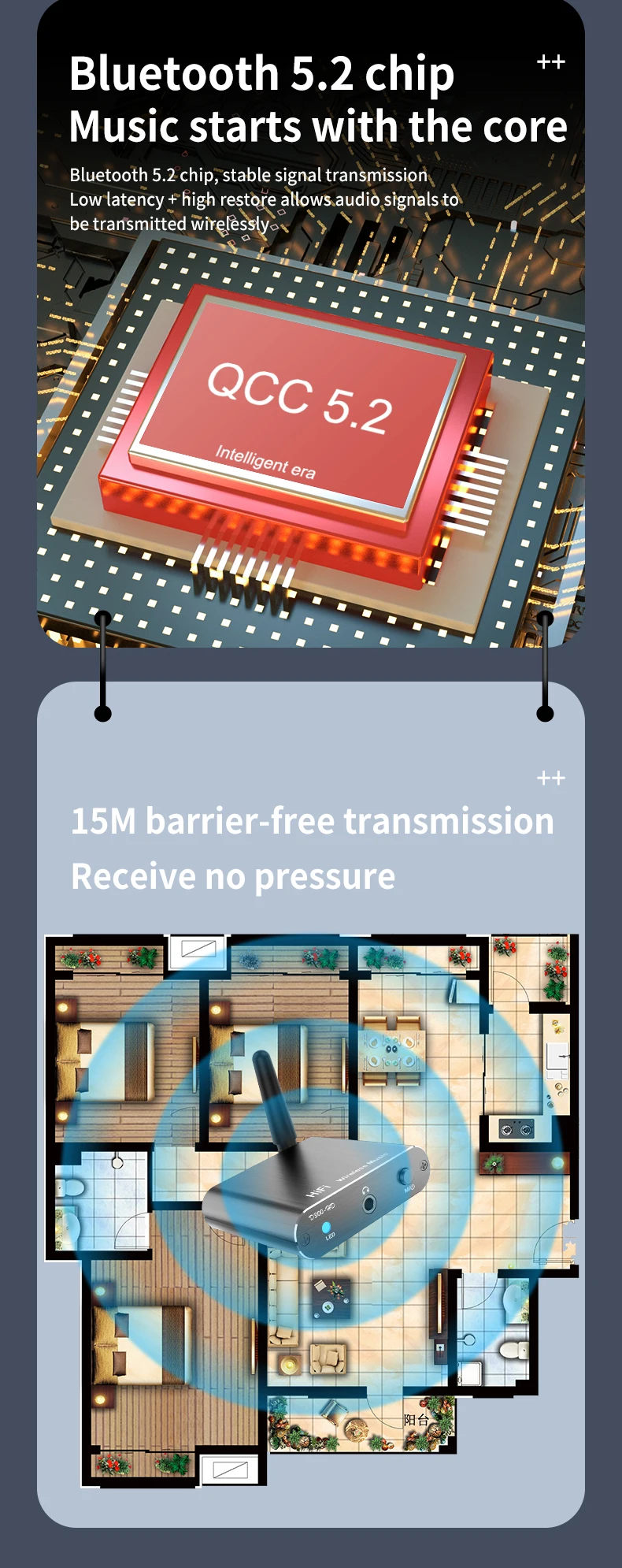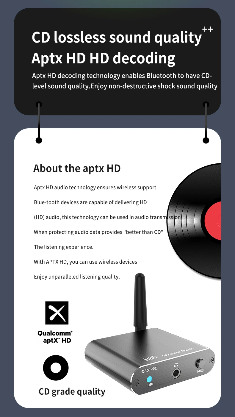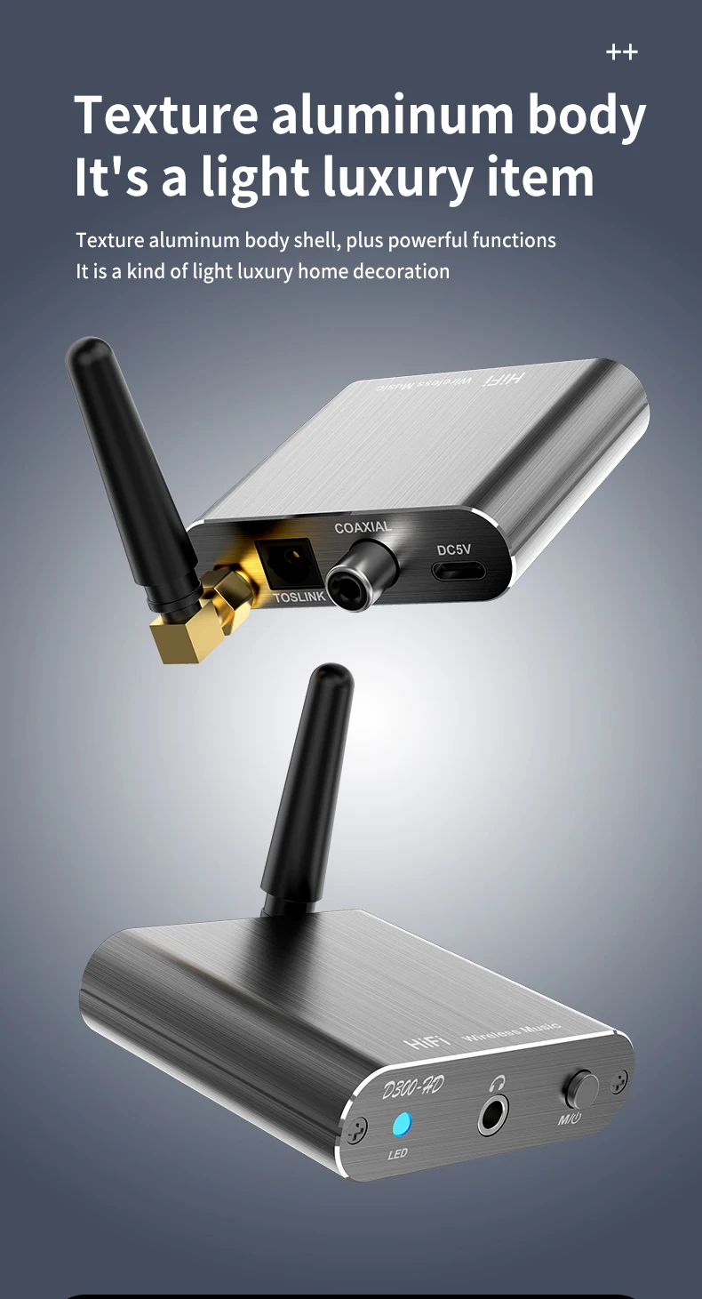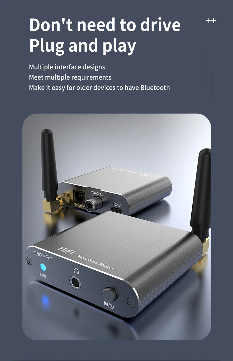 Compatível com todos os tipos de equipamentos antigos de amplificador de áudio, sinal forte sem demora, alta fidelidade APTX-HD, aproveite a qualidade de som de nível de CD.