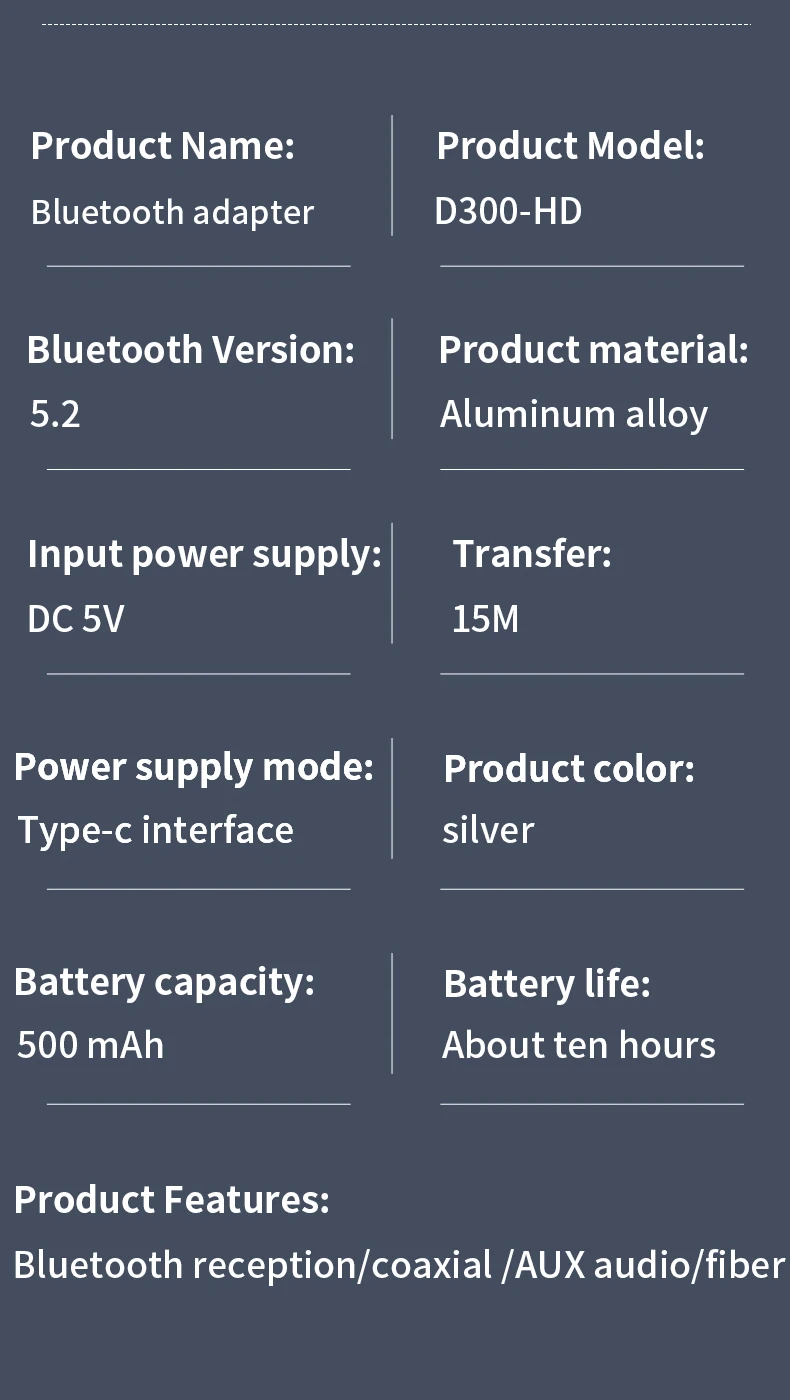 1x adaptador de áudio D300-HD Qualcomm Bluetooth 5.2