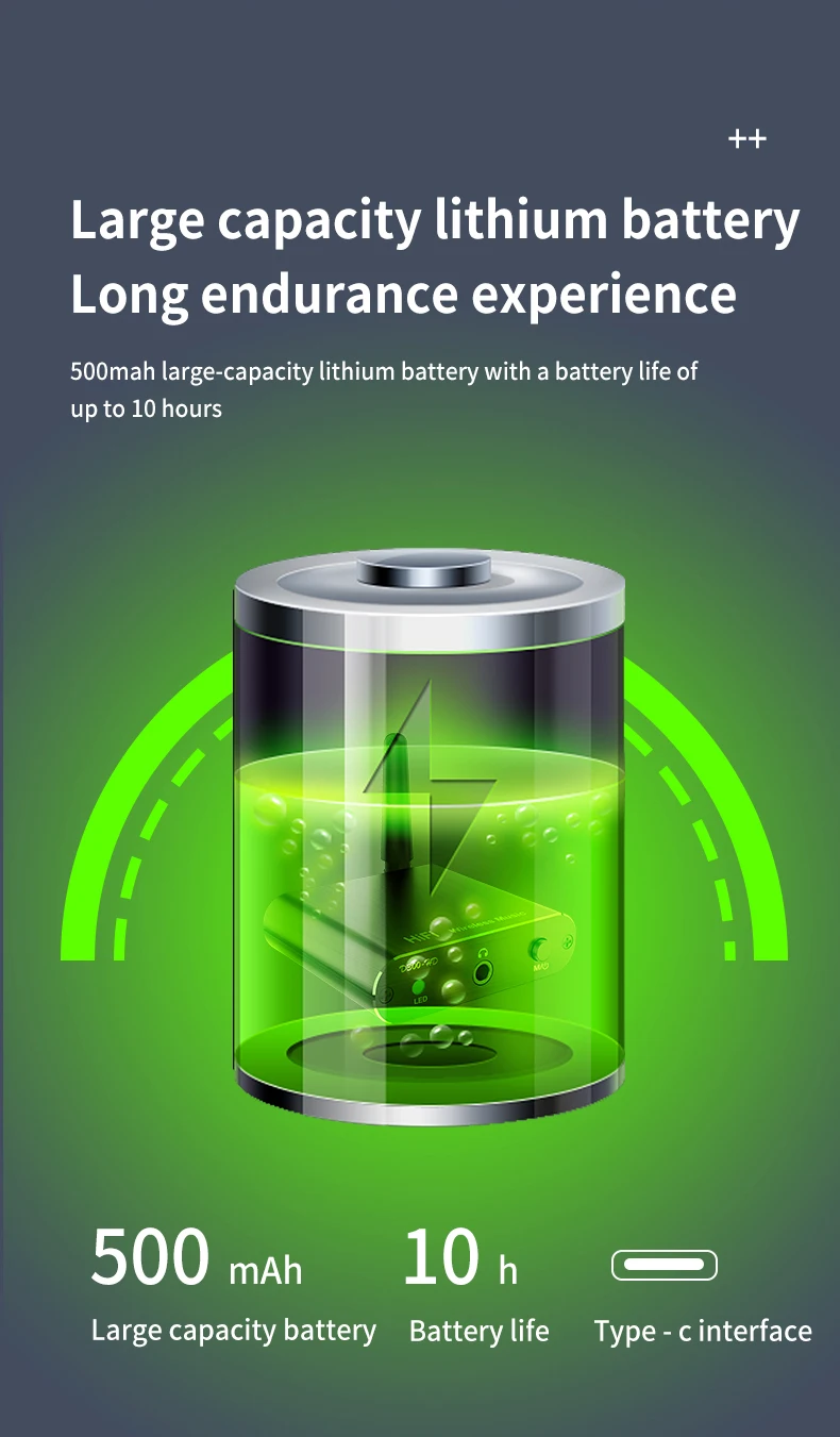 Bateria de lítio de grande capacidade de 500mAh com duração de bateria de até cerca de 10 horas.