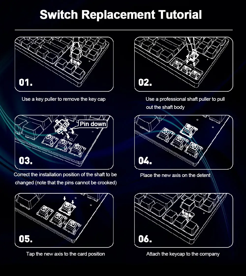 • Interruptores de troca quente :Os interruptores são hot swap, o que significa que você pode facilmente substituí-los sem soldar.