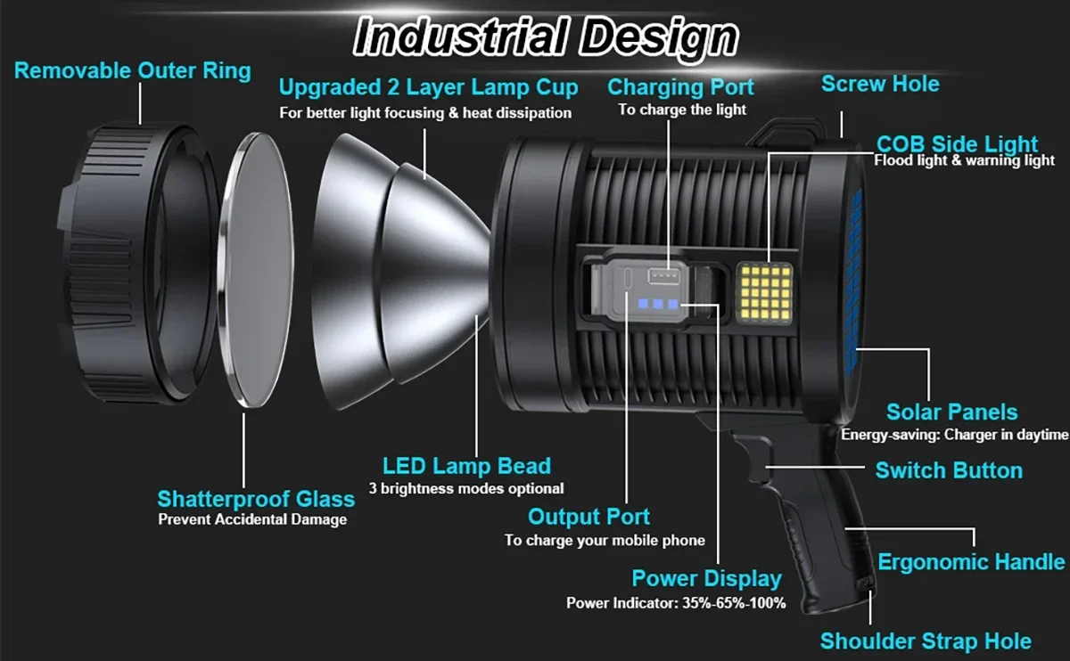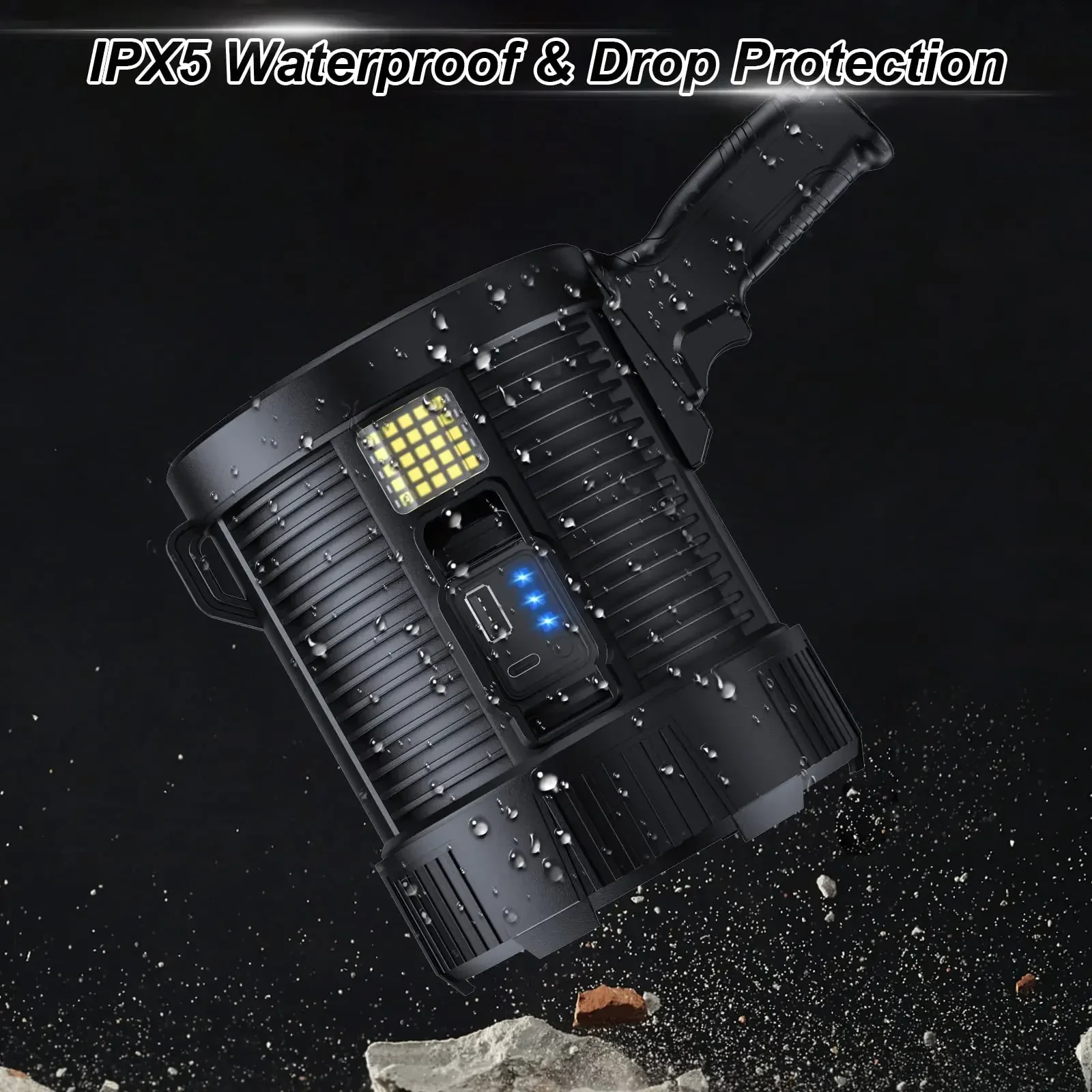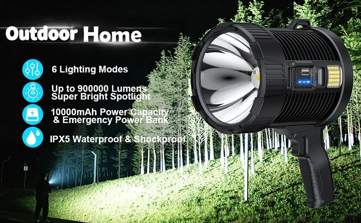 【Foco portátil super brilhante】Lanterna holofote de 900000 lúmens com chip LED P90 integrado, luz estável e brilhante.A distância de irradiação é de cerca de 2625 pés (800 m).Alto brilho, longa distância