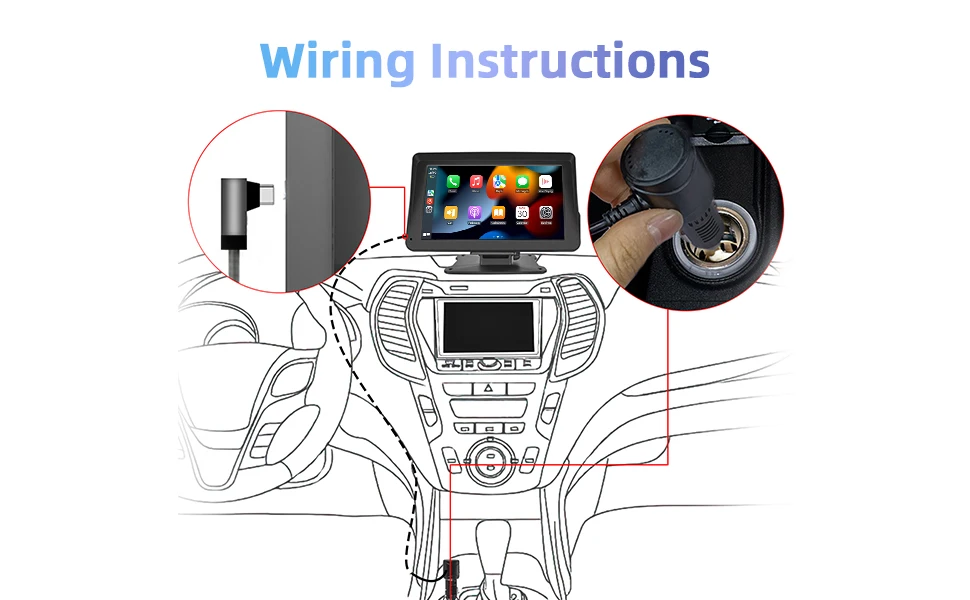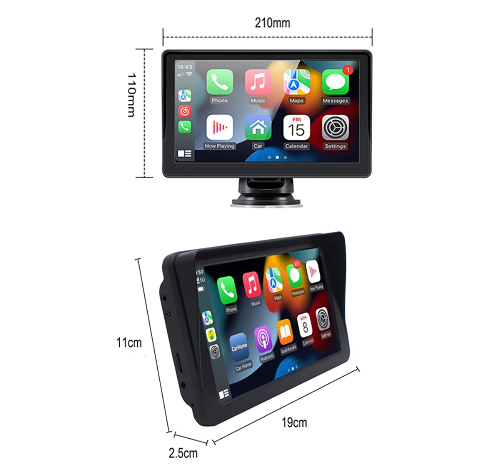 【O que você receberá】Tela portátil Apple CarPlay de 1 * 7 polegadas, 1 * suporte, 1 * plugue de isqueiro, 1 * cabo AUX de 3 mm, 1 * suporte de adesivo.