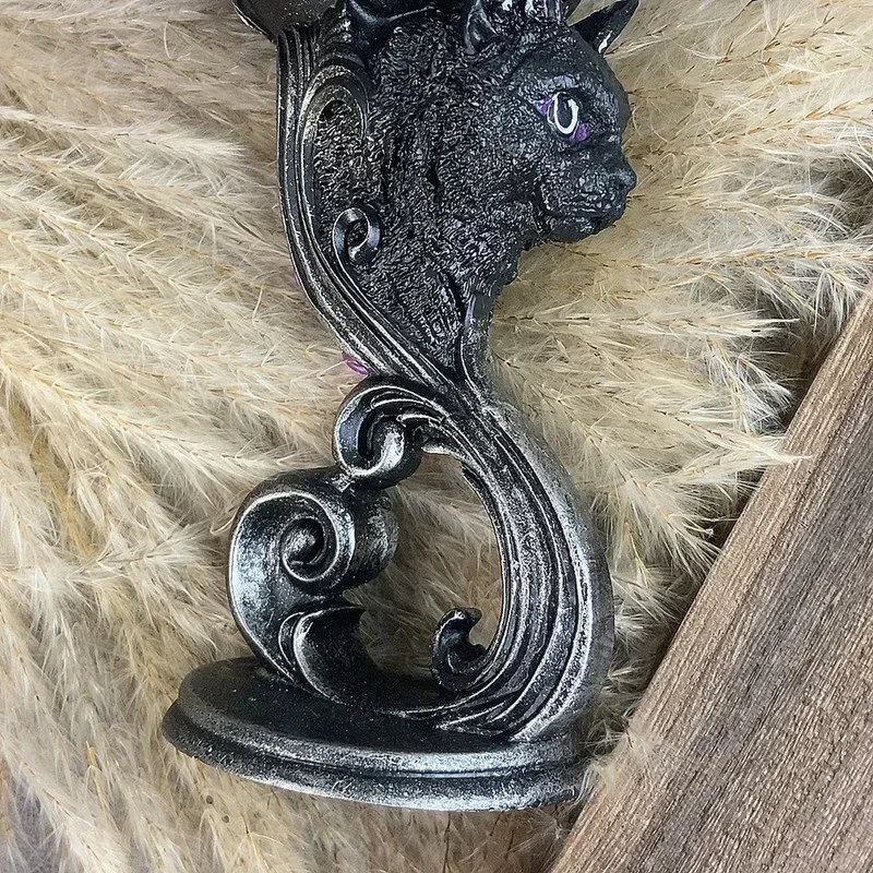 No centro do caule cuidadosamente esculpido está a cabeça de um gato preto de olhos roxos familiar que se projeta para fora. Acima dele é um pentagrama, em seu coração é uma pedra preciosa roxa
