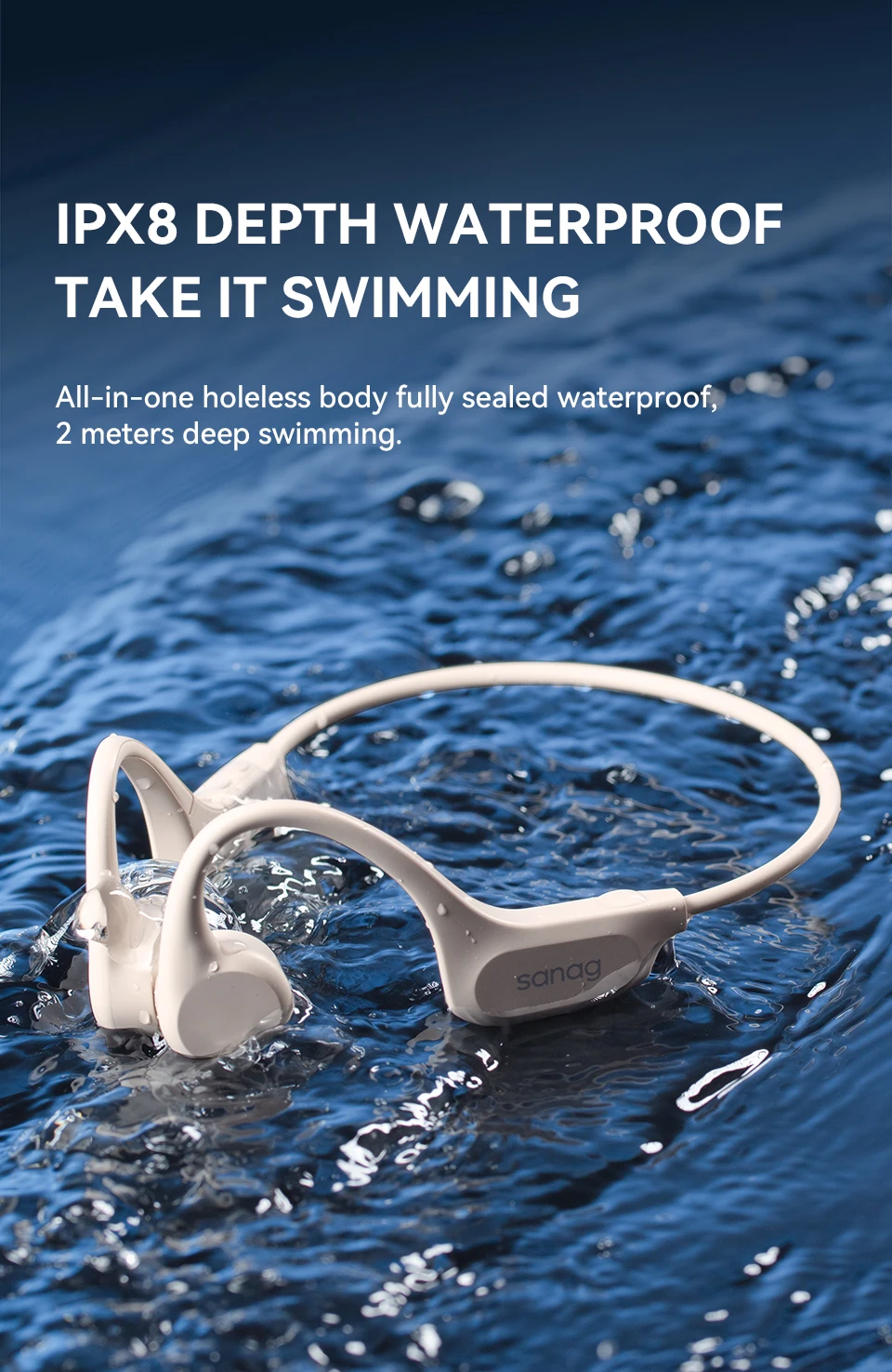IPX8 impermeável------ Excelente desempenho à prova d'água, Ouça música durante a natação, Mergulho também pode ouvir música 。