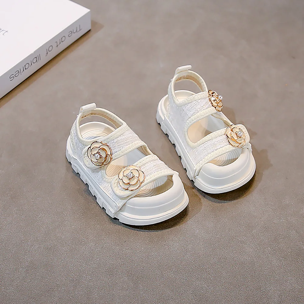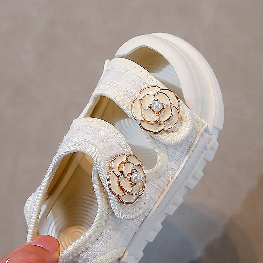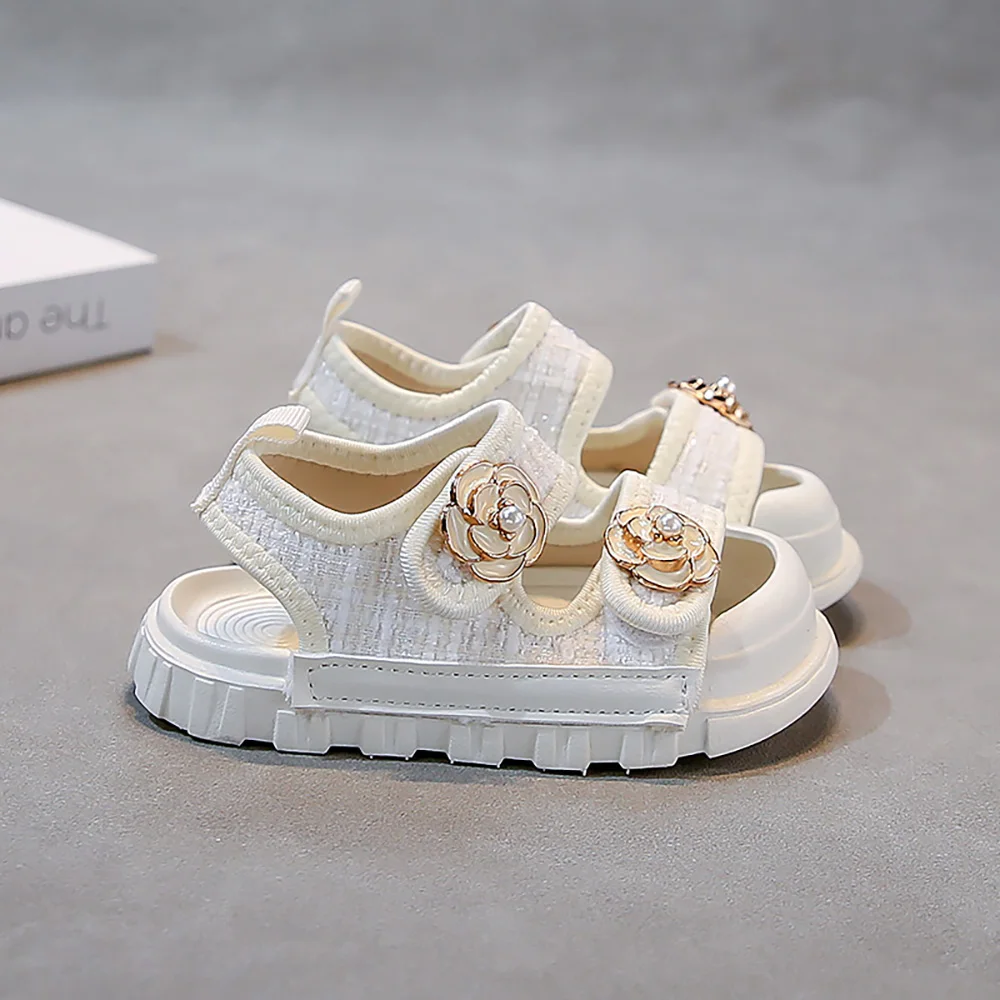 - > Sandálias de verão estilo coreano para meninas, luxo, flor de pérola, sapatos de praia infantis, ergonomia, sola macia, sandálias para meninas