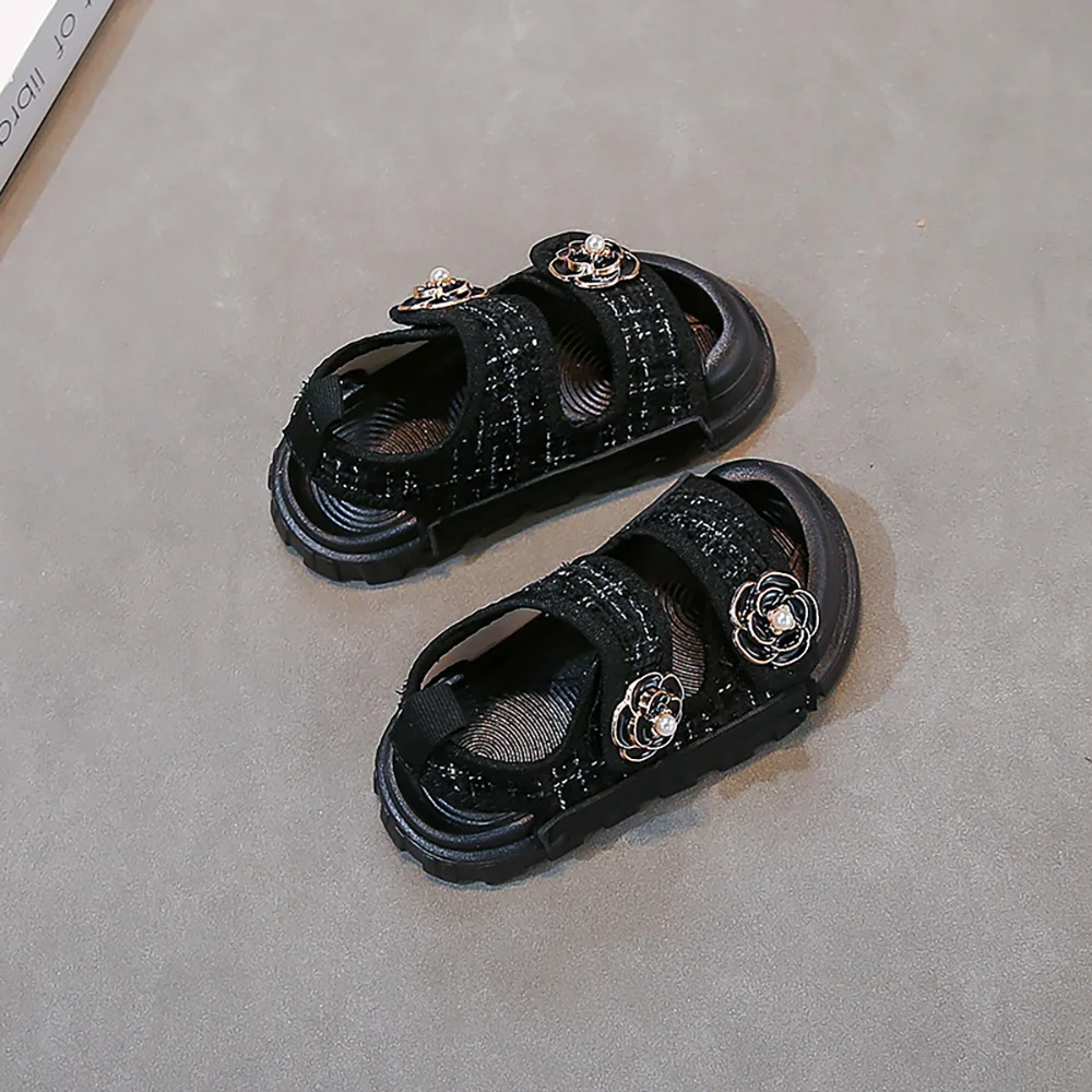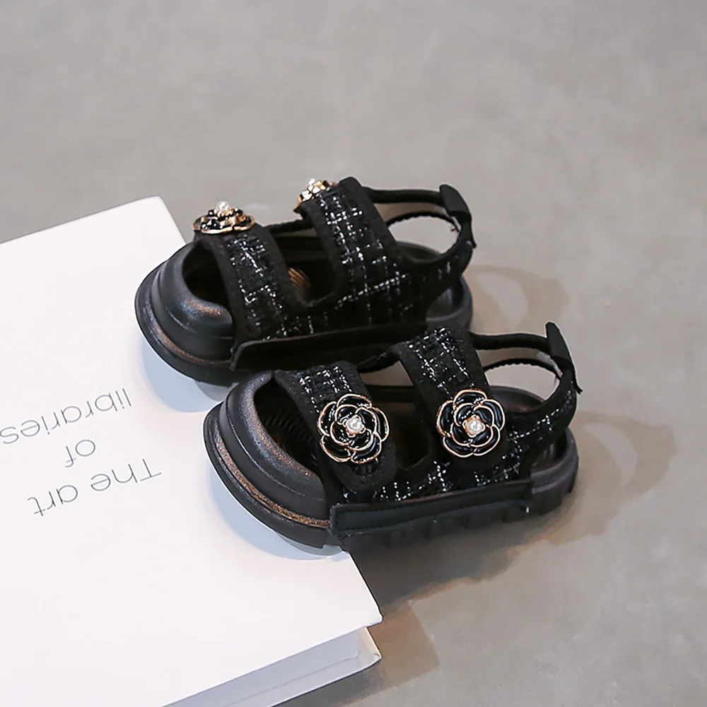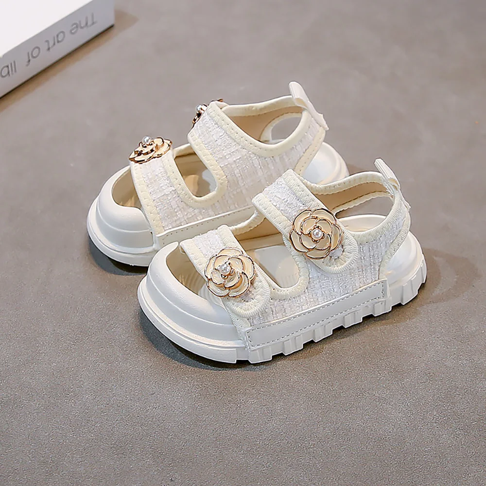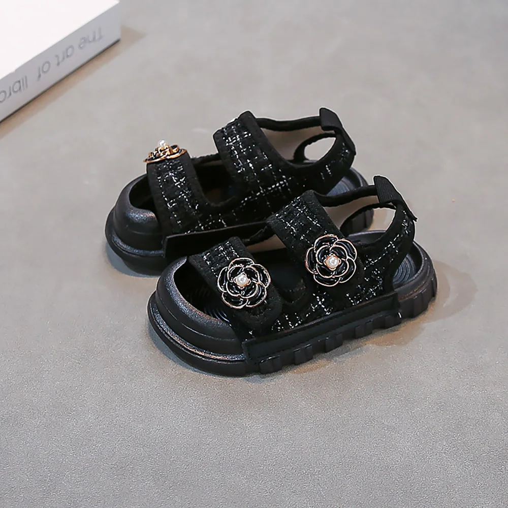 - > Sandálias de verão estilo coreano para meninas, luxo, flor de pérola, sapatos de praia infantis, ergonomia, sola macia, sandálias para meninas