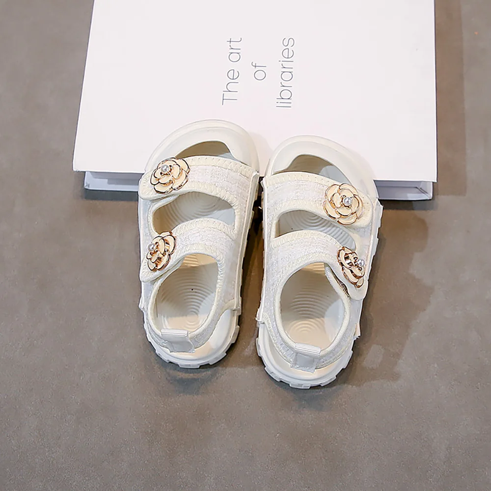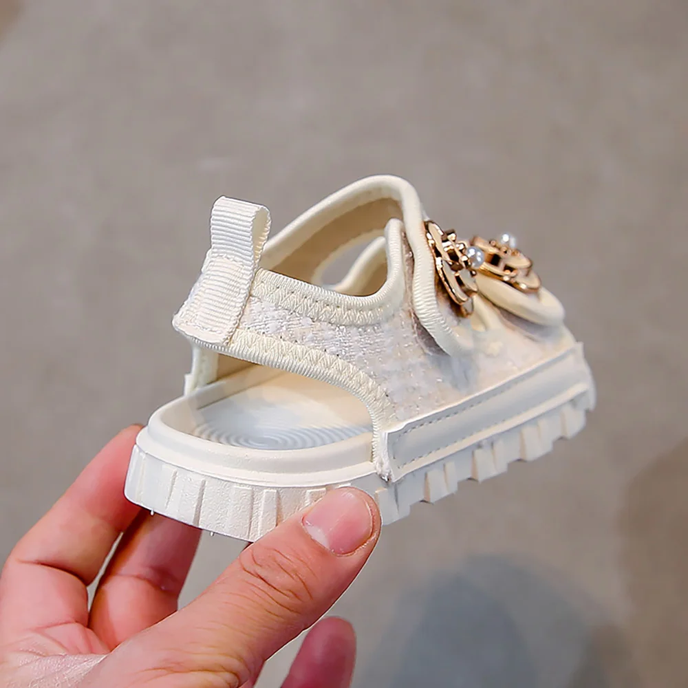 Sandálias de verão estilo coreano para meninas, luxo, flor de pérola, sapatos de praia infantis, ergonomia, sola macia, sandálias para meninas