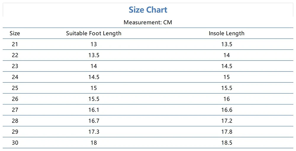 Observe que os tamanhos dos calçados infantis podem variar entre os diferentes países.Para garantir o melhor ajuste, recomendamos fortemente selecionar o tamanho com base em nossa tabela de tamanhos fornecida, em vez de sua escolha de tamanho normal.Se não tiver certeza, sinta-se à vontade para nos enviar o comprimento do pé do seu filho e teremos prazer em recomendar o tamanho mais adequado.Isso ajudará a evitar problemas de tamanho e economizará um tempo valioso, garantindo que os sapatos caibam perfeitamente desde o início!
