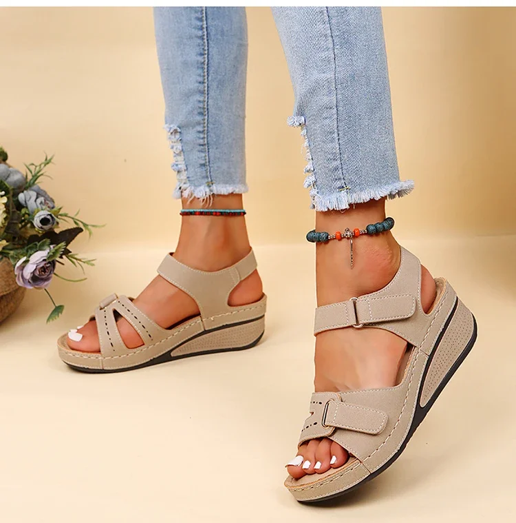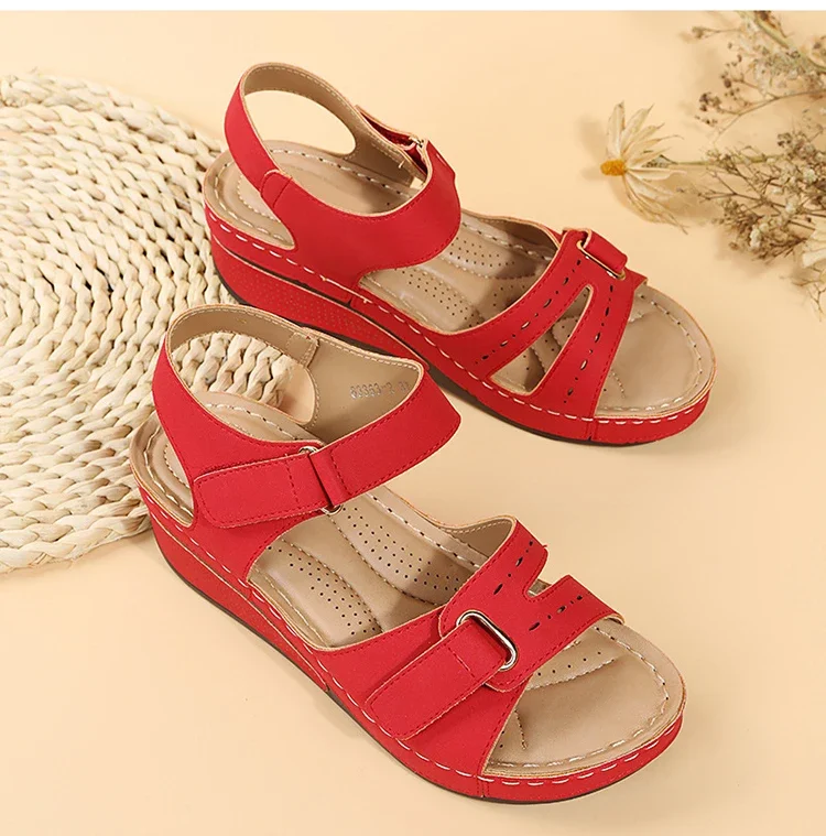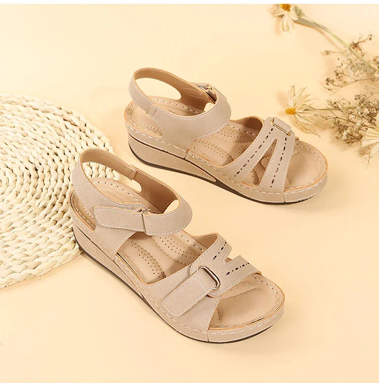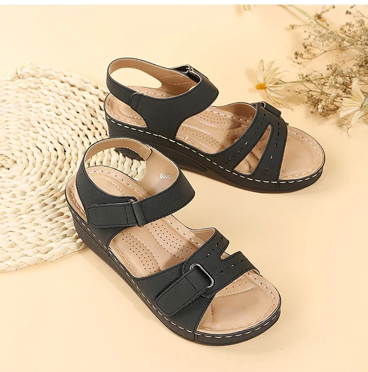 Sandálias macias de toe aberto para mulheres, fivela de cunha, sandália ortopédica, calçado feminino, nova moda, verão, 2023