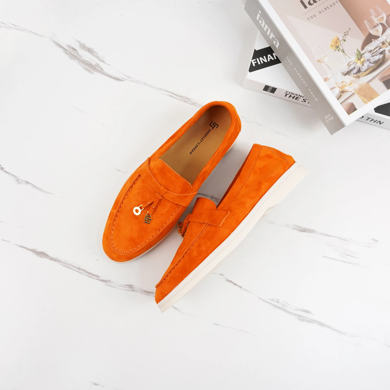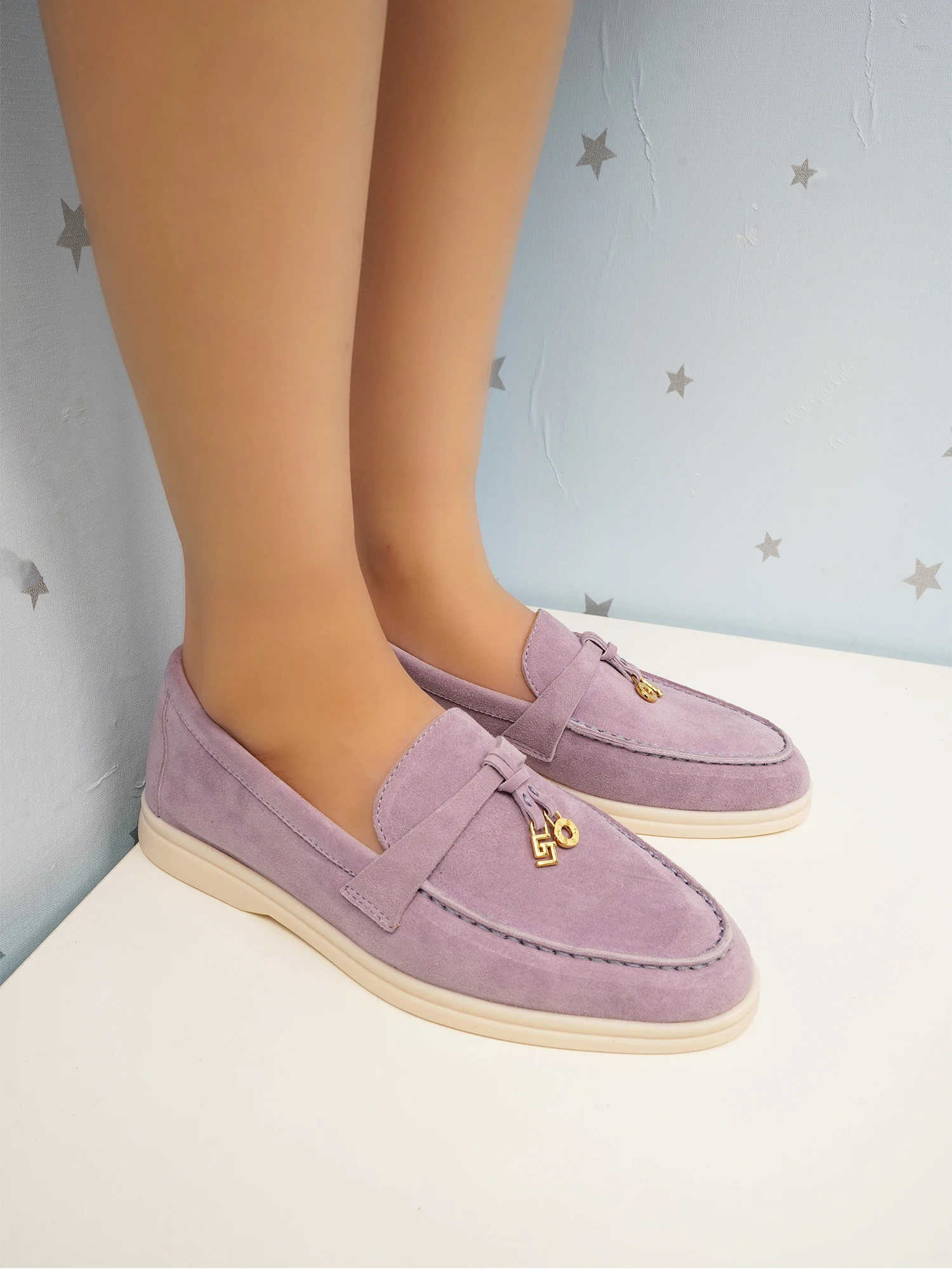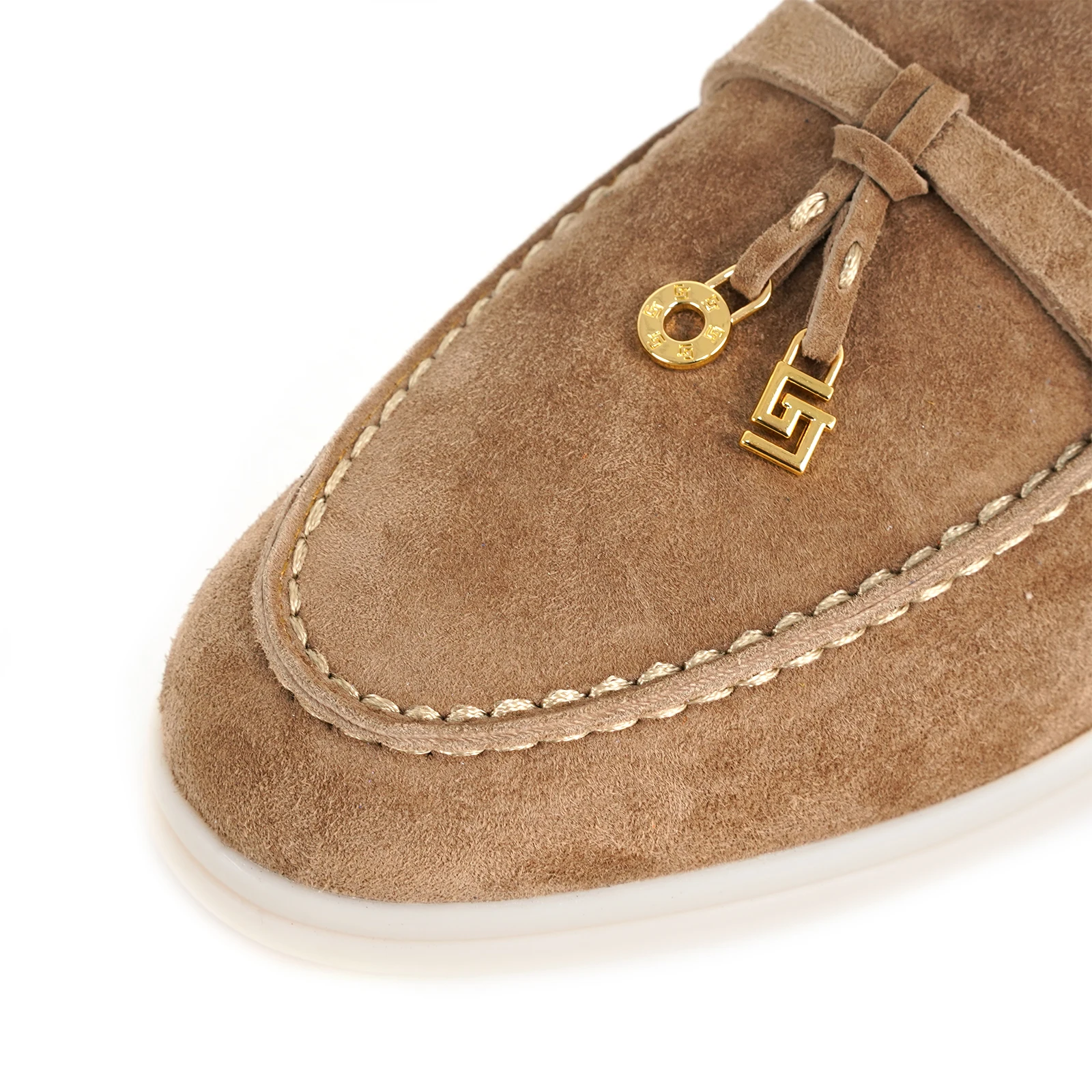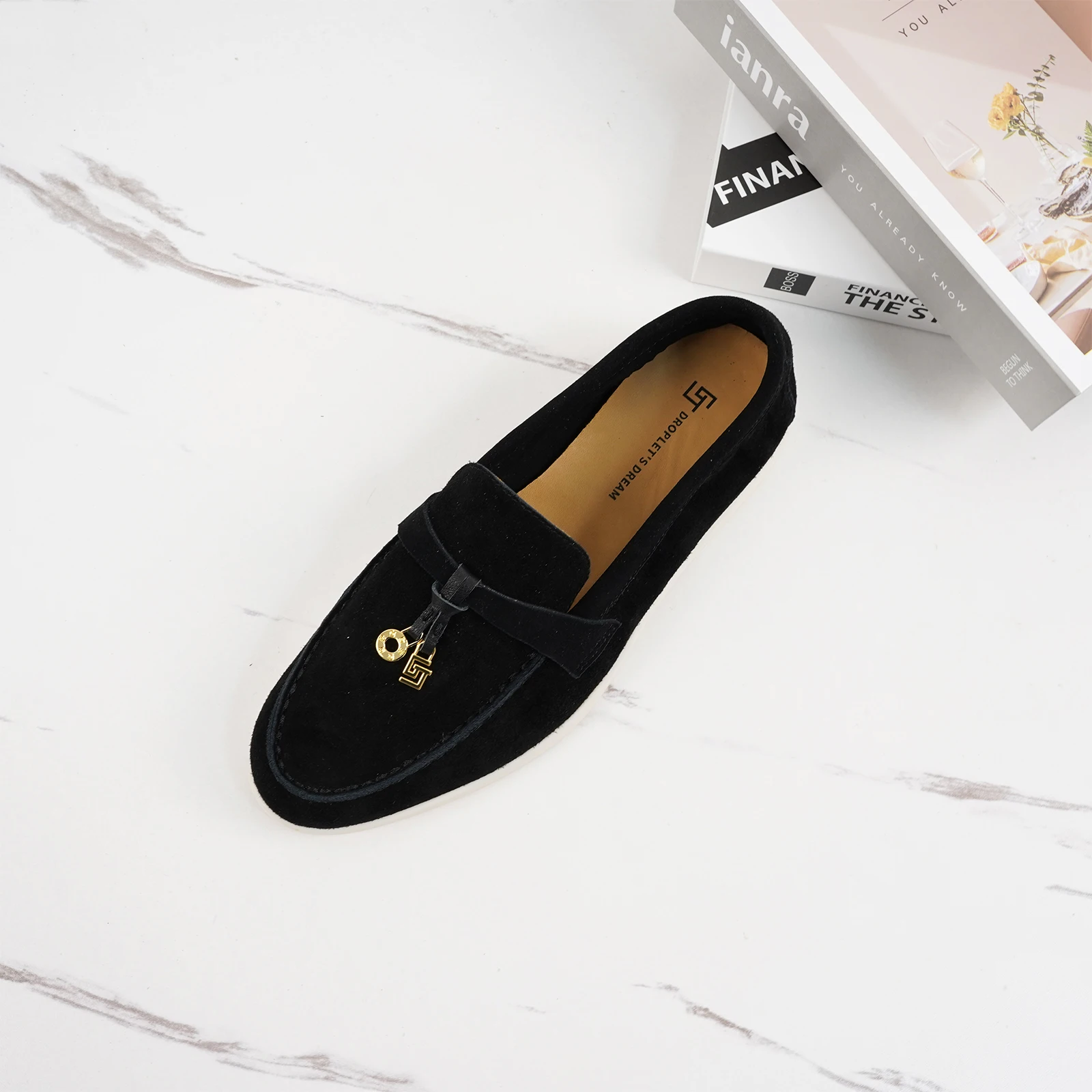 Sapatos de mula de camurça antiderrapante para mulheres, sapatos para dirigir, pingente de metal, marca de luxo, moda casual confortável, Le Fu