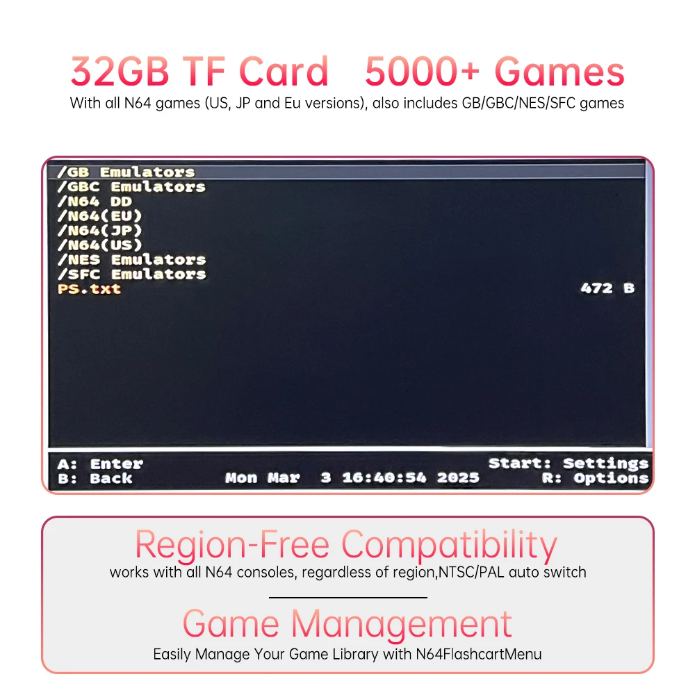 •Compatibilidade de jogos extremamente alta: Suporta jogos N64 de até 64 MB (512 Mb), cobrindo toda a biblioteca de jogos N64.