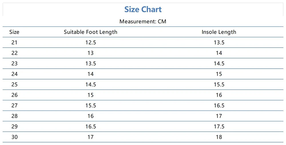 Observe que os tamanhos dos calçados infantis podem variar entre os diferentes países.Para garantir o melhor ajuste, recomendamos fortemente selecionar o tamanho com base em nossa tabela de tamanhos fornecida, em vez de sua escolha de tamanho normal.Se não tiver certeza, sinta-se à vontade para nos enviar o comprimento do pé do seu filho e teremos prazer em recomendar o tamanho mais adequado.Isso ajudará a evitar problemas de tamanho e economizará um tempo valioso, garantindo que os sapatos caibam perfeitamente desde o início!