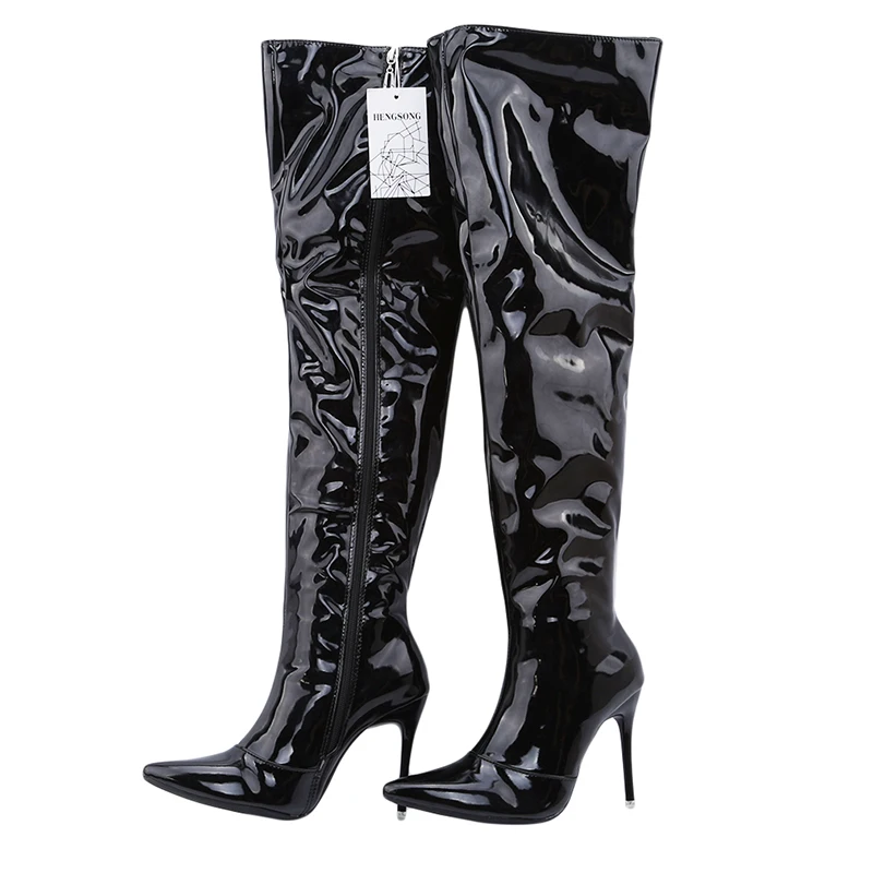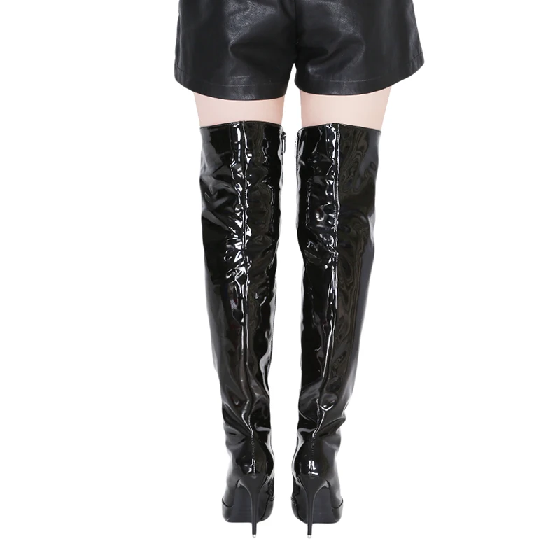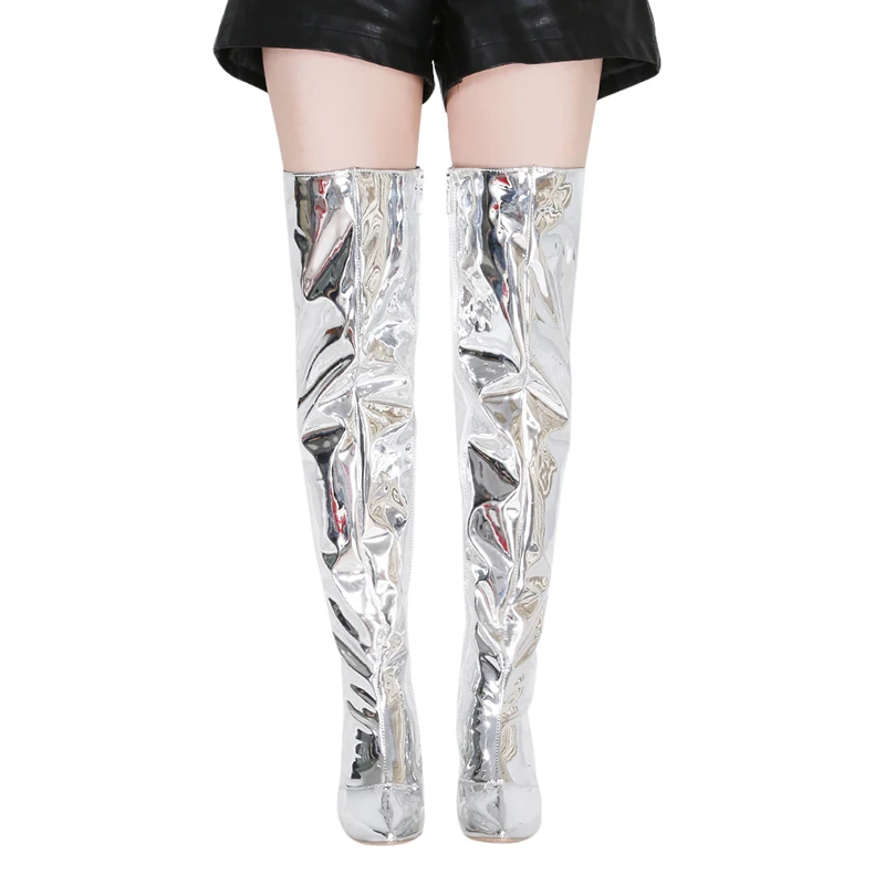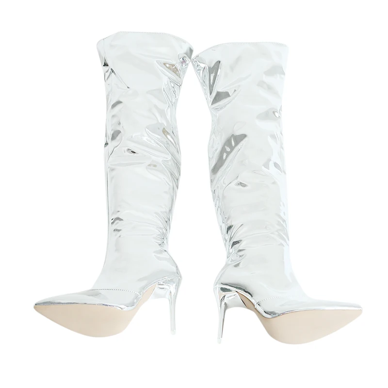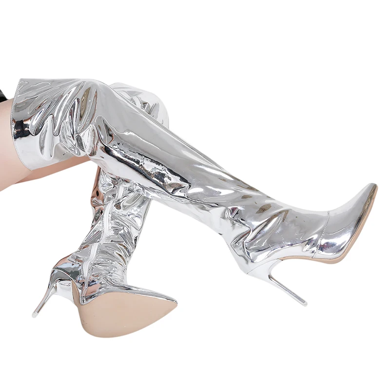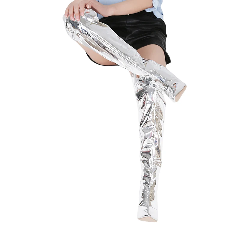 - > Sexy espelho prateado coxa botas altas para mulheres, T Show Pointy Toe, sapatos de festa do clube, saltos altos finos, botas longas sobre o joelho