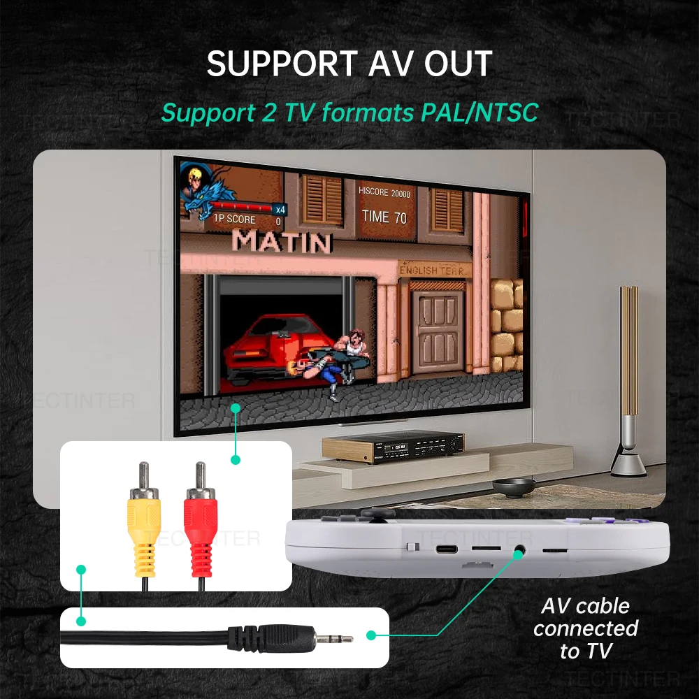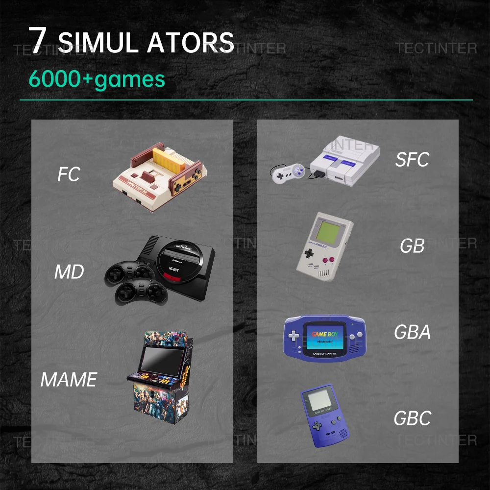 O console de jogos integrado em um cartão TF de 16 GB, inclui mais de 6.000 jogos e 7 emuladores, também suporta download de jogos você mesmo.