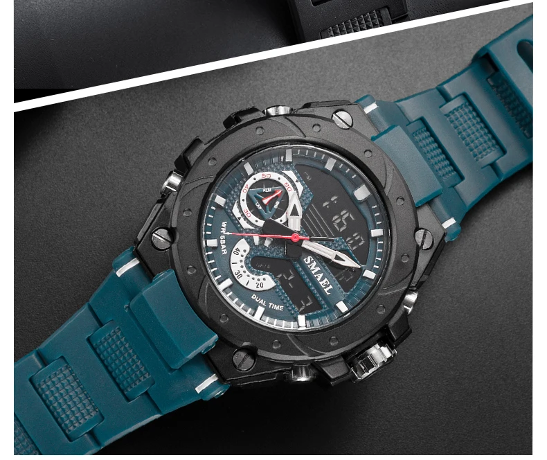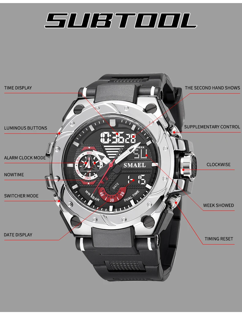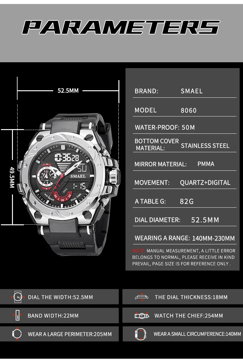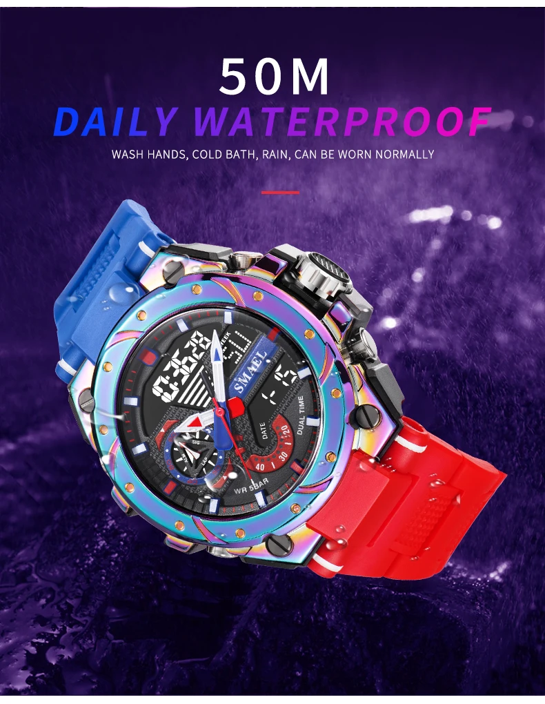 SMAEL-Relógio desportivo de quartzo masculino com ecrã LED, resistente a choques, despertador impermeável, analógico, 8060, 50m