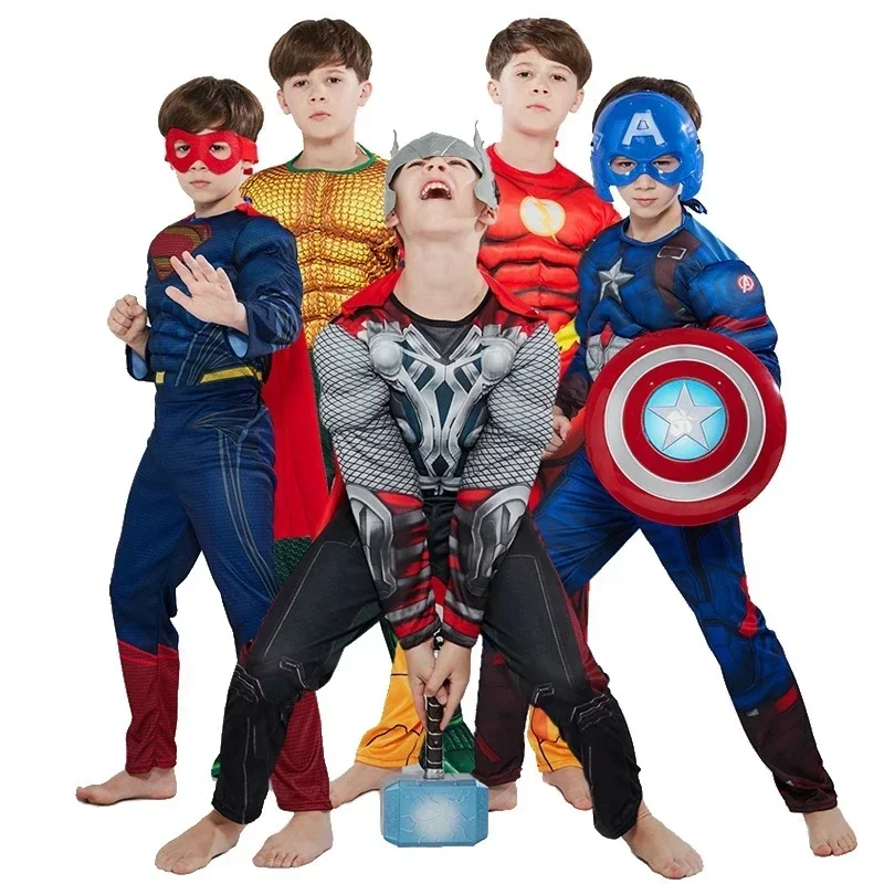 Super-herói homem aranha capitão américa homem de ferro thor hulk batman cosplay traje muscular bodysuit macacão para crianças festa de halloween