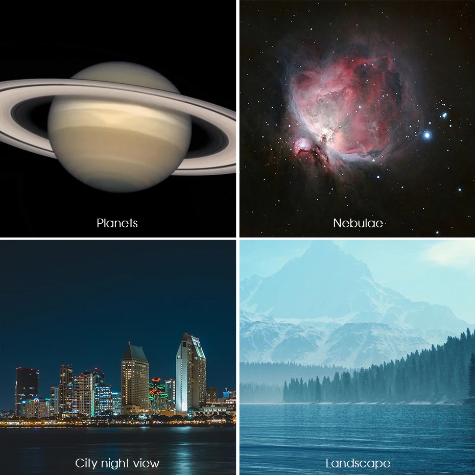 Abertura de 90 mm; Distância focal de 500 mm; em comparação com 70 mm e 80 mm; O telescópio de 90 mm tem mais entrada de luz e um campo de visão mais amplo; observar a lua e o espaço profundo; o que é muito adequado para iniciantes em astronomia