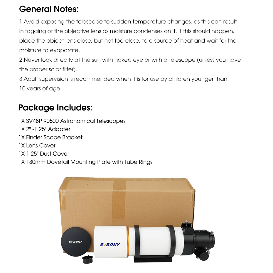 R:O pacote inclui telescópio astronômico SV48P 90500 OTA, adaptador de 2" -1,25", suporte de escopo localizador, tampa de lente, tampa contra poeira de 1,25", placa de montagem em cauda de andorinha de 130 mm com anel de tubo