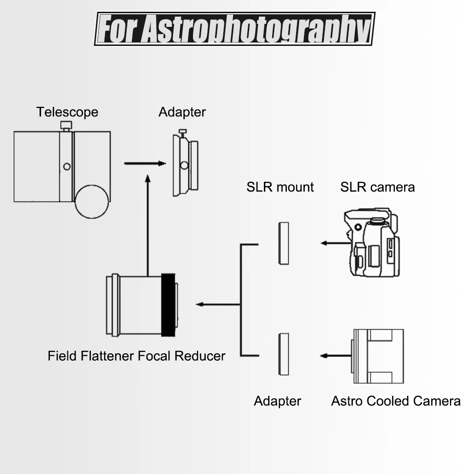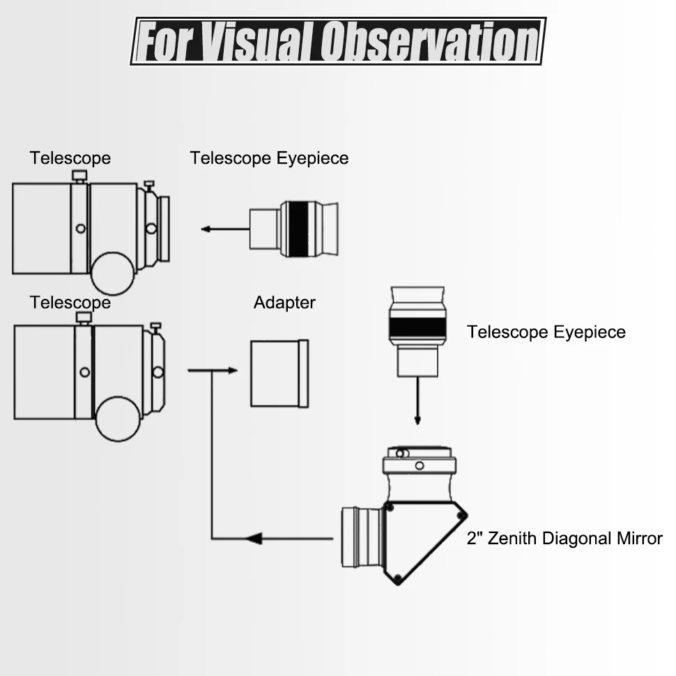 O refrator SV550 é compatível com acessórios de 2 polegadas e M63*1.A frente é um adaptador de 2 polegadas para conectar uma câmera ou acessórios de 2 polegadas; Girando o adaptador, aqui rosqueou as roscas M63*1, para conectar o alisador de campo SV209 ou outros acessórios M63*1.