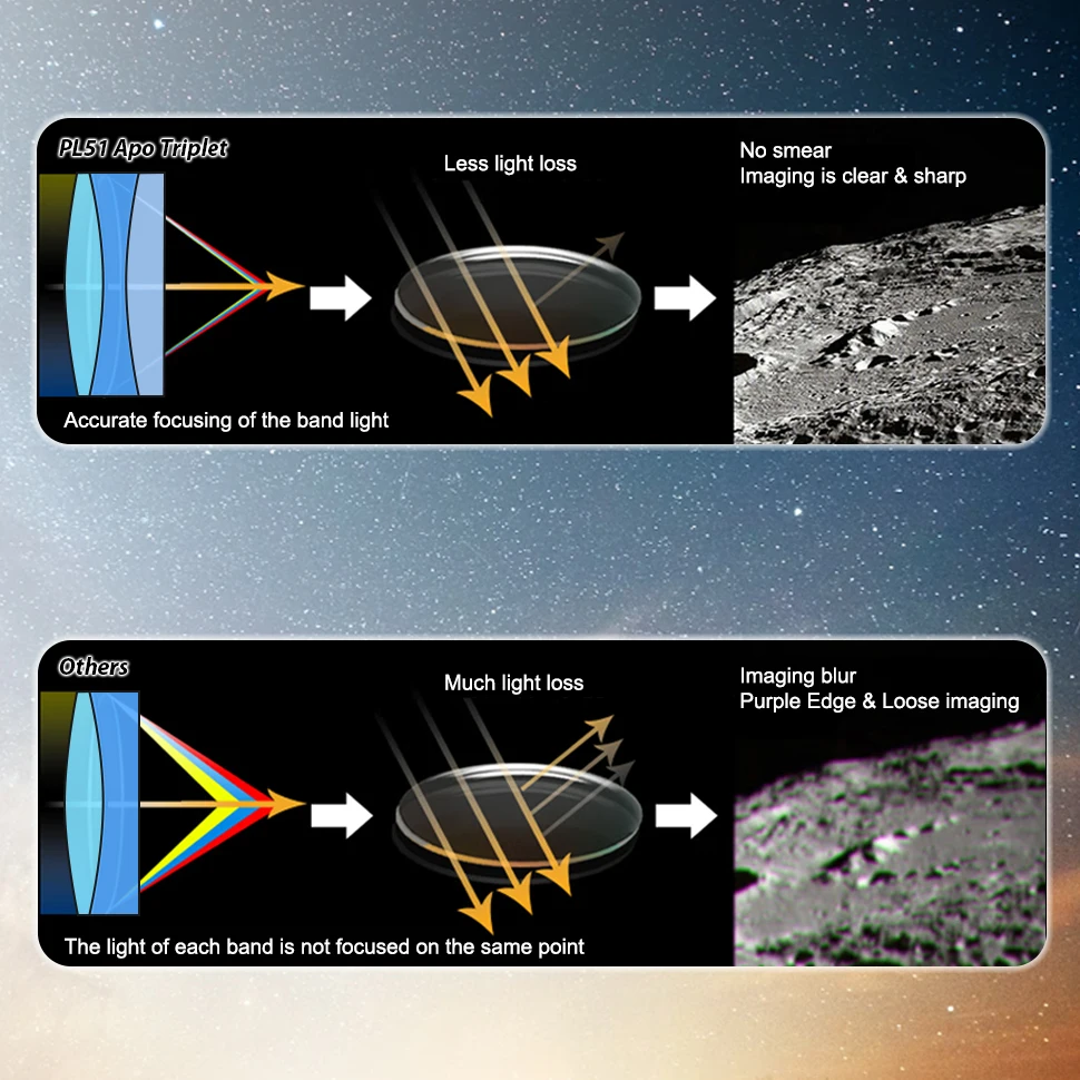 O refrator APO possui uma abertura de 122 mm que coleta mais luz e oferece imagens mais claras e detalhadas, adequadas para fotografia e observação do céu profundo e até mesmo alguns objetos fracos do céu profundo, devido à maior magnitude limitadora.