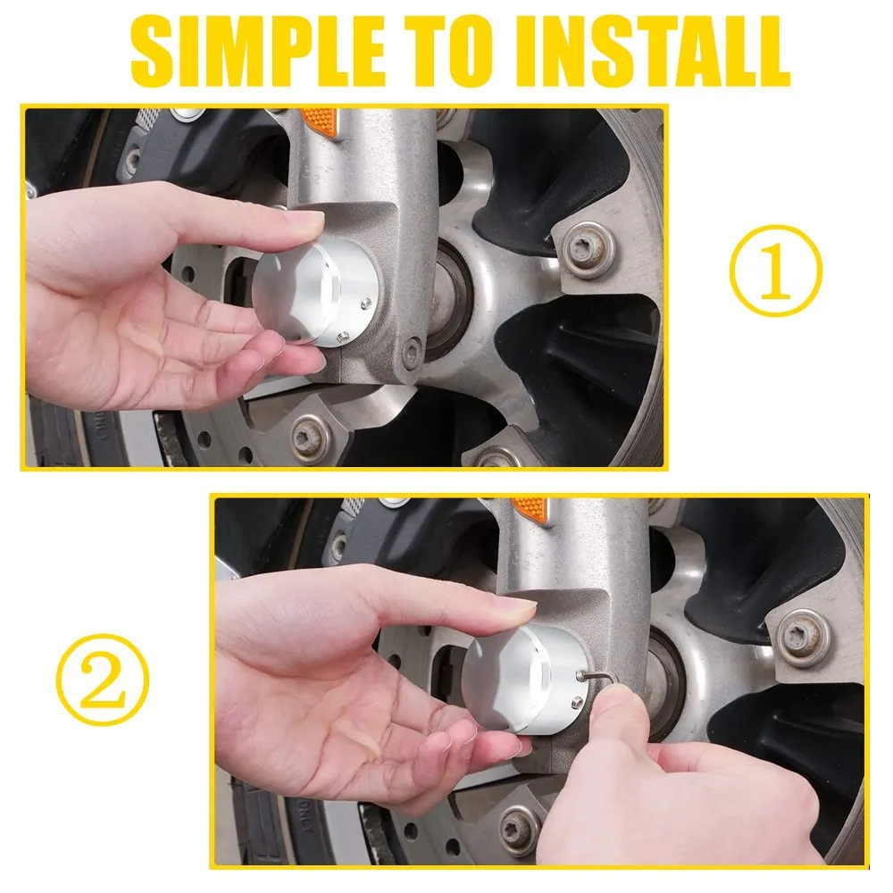 3.The front wheel axle nut cover feature contrasting chrome and sculpted machined surfaces that send reflections of light in all directions. Perfect match for front axle hardware, making your vehicle unique and cool.