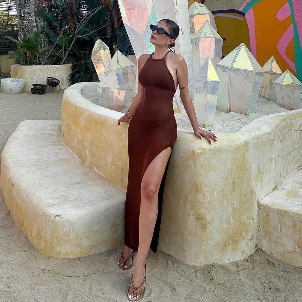 - > Tecido ver através do vestido maxi, Elegante Halter Beachdress, Sexy Slit Bodycon, Vestido de verão, Beachdress, Ver através, 2022