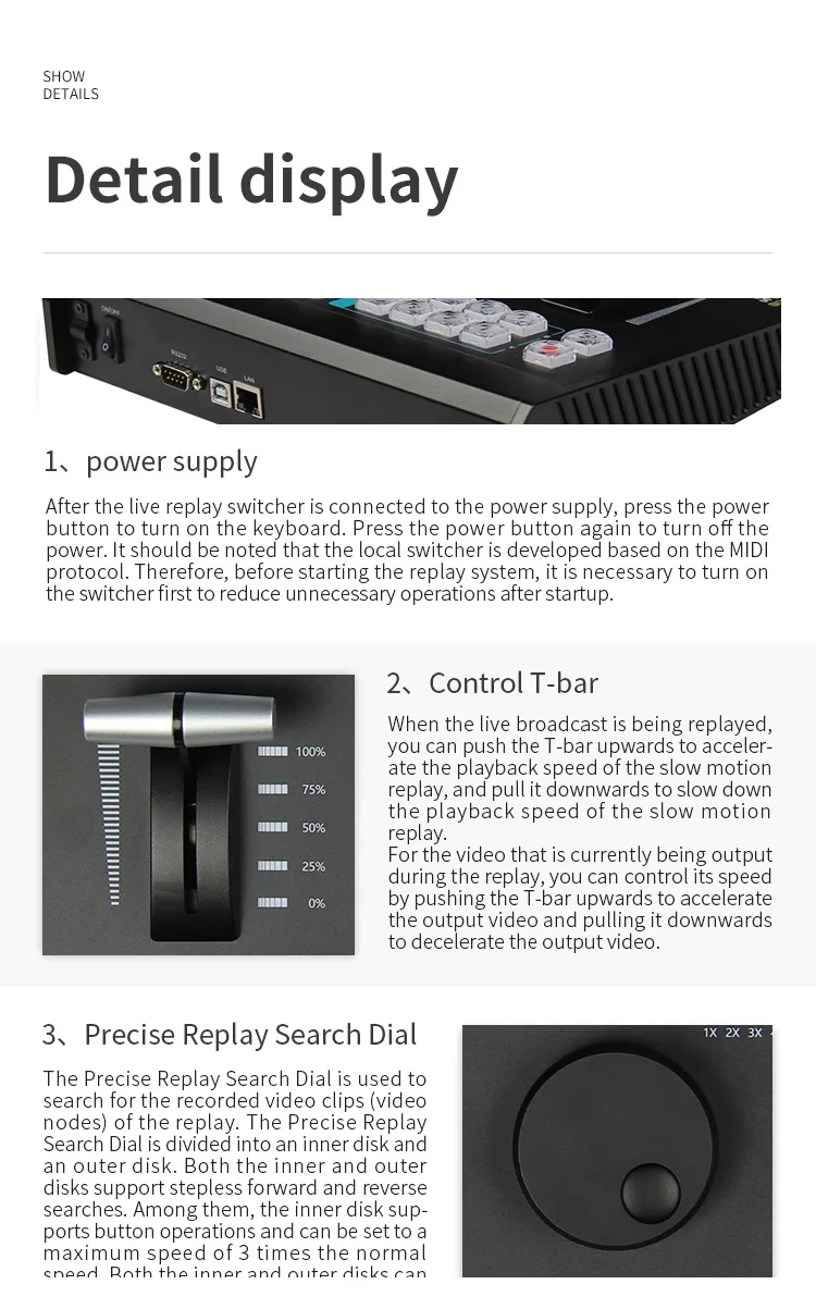 - > Teclado de reprodução ao vivo, alça de controle de pesquisa, efeitos especiais, protocolo midi, usb, evento esportivo, uso de replay de movimento lento