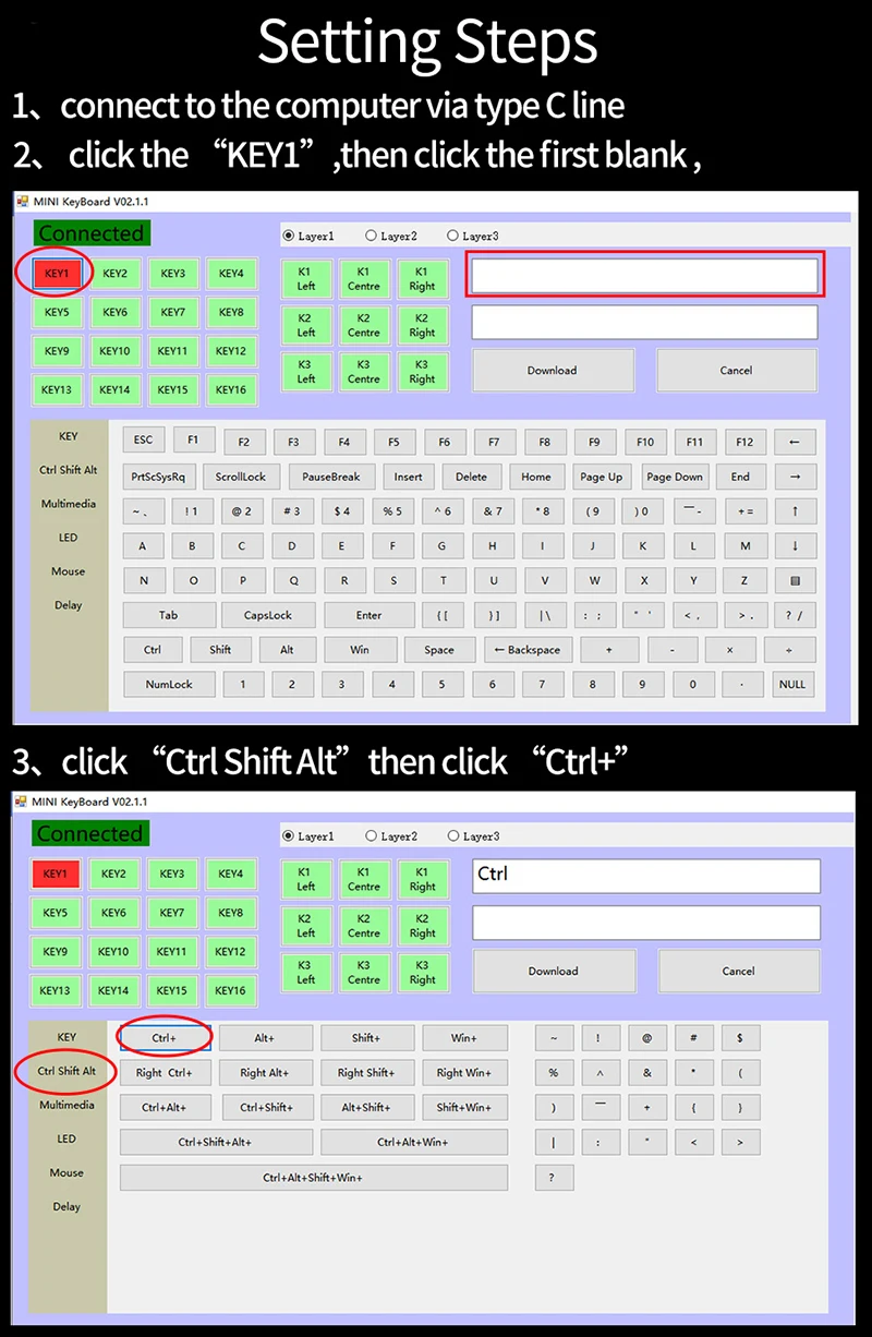 Este é um mini teclado com funções personalizadas, Tipo-C para interface USB, sem driver necessário, plug and play.Button personalização, pode ser definido de acordo com suas necessidades.