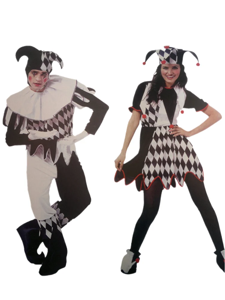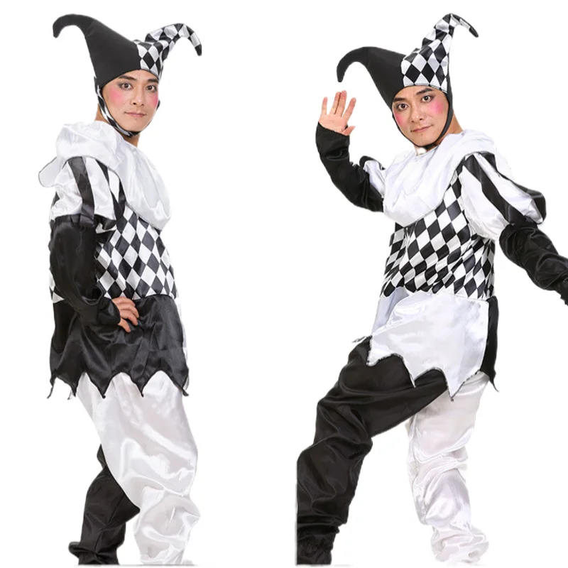 Trajes de carnaval de halloween engraçado diversão cosplay preto e branco emenda palhaço traje com chapéu para homem mulher conjunto inovador