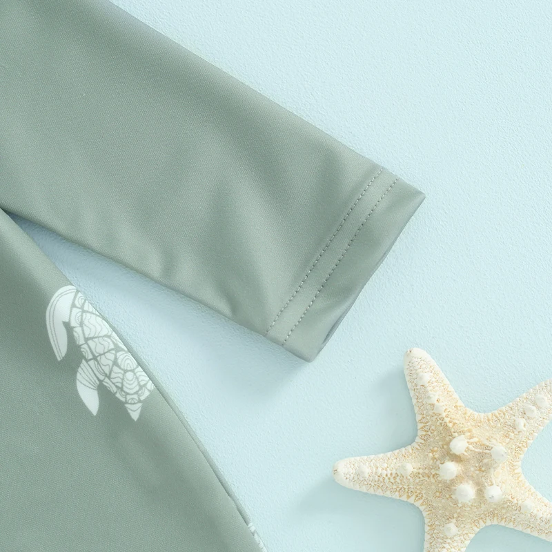 Maiô protetor contra erupção cutânea para meninos, macacão de manga comprida com estampa de tartaruga/dinossauro, roupa de banho para bebê com touca de natação