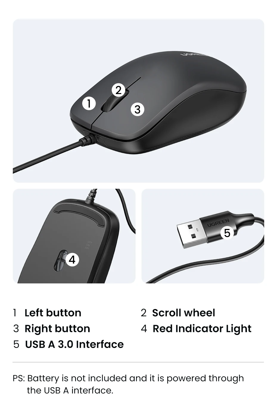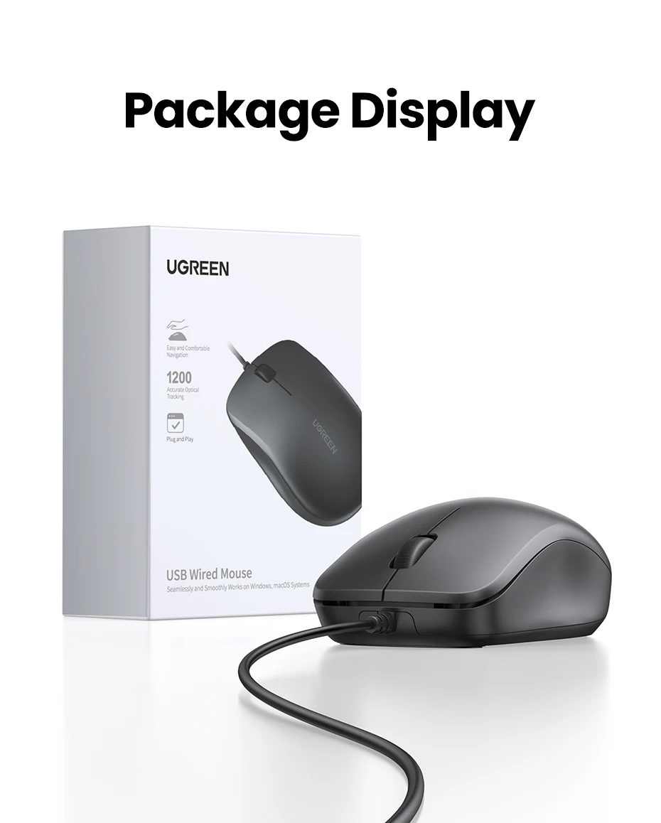 - > UGREEN-USB Mouse com fio com design ergonômico, 1200 DPI, 3 botões para laptops e PCs